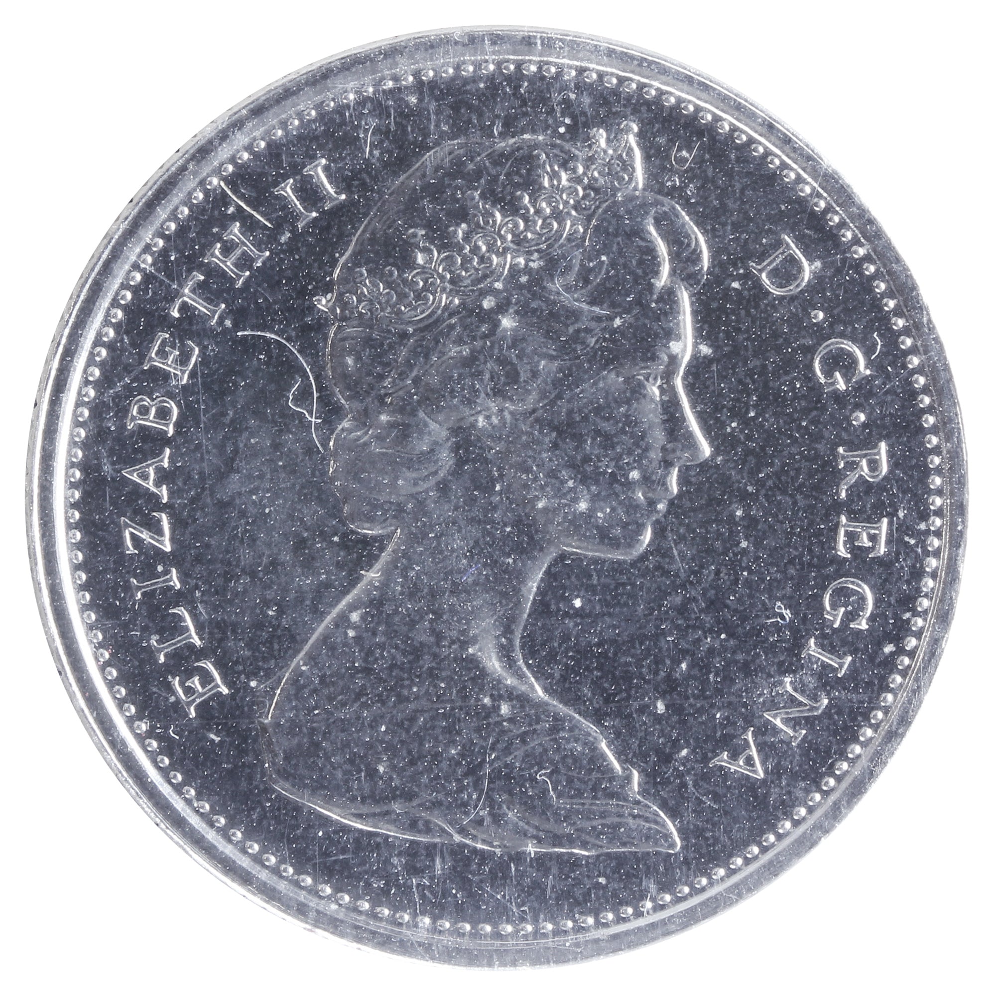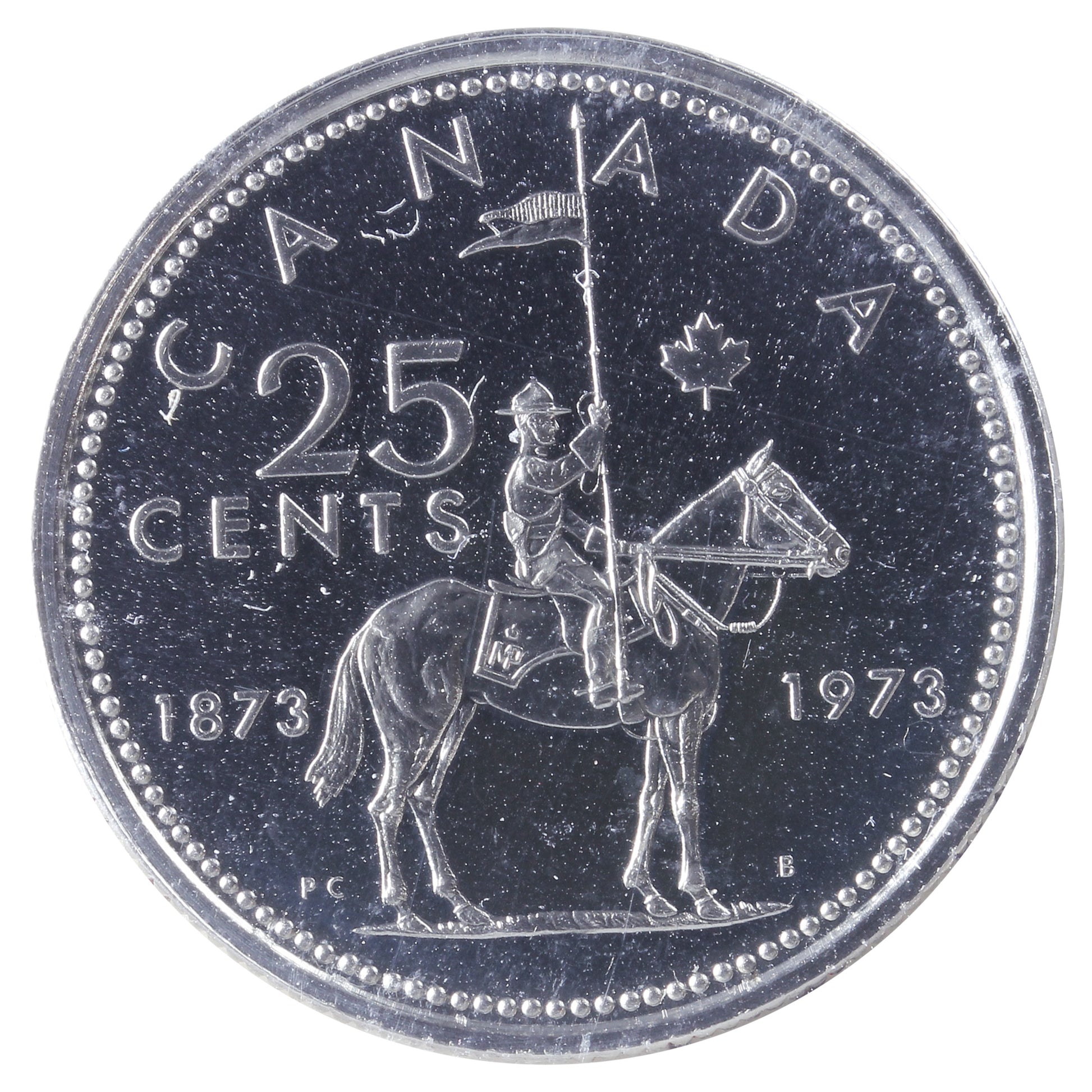 The special reverse of the 1973 25-cent piece commemorates the centennial of the founding of the North West Mounted Police, later known as the Royal Canadian Mounted Police. For use with this issue, a new obverse with a smaller, more detailed portrait and fewer rim beads placed farther from the rim was created, however, a small quantity of coins were struck with the 1972 obverse, creating two varieties for the year; the Large Bust and Small Bust. It is believed that the Large Bust variety struck for circulation does not exceed 10,000.