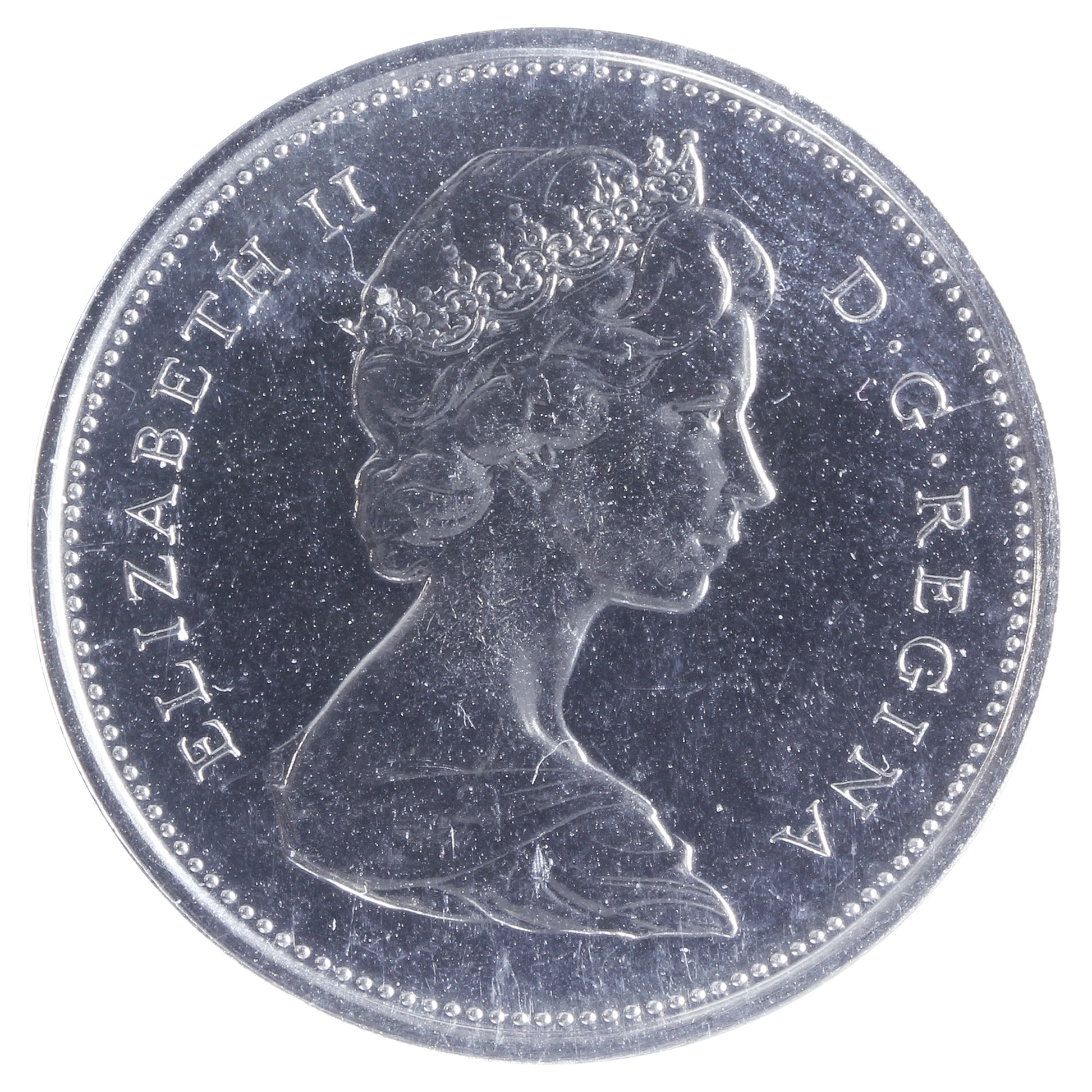 The special reverse of the 1973 25-cent piece commemorates the centennial of the founding of the North West Mounted Police, later known as the Royal Canadian Mounted Police. For use with this issue, a new obverse with a smaller, more detailed portrait and fewer rim beads placed farther from the rim was created, however, a small quantity of coins were struck with the 1972 obverse, creating two varieties for the year; the Large Bust and Small Bust. It is believed that the Large Bust variety struck for circulation does not exceed 10,000.