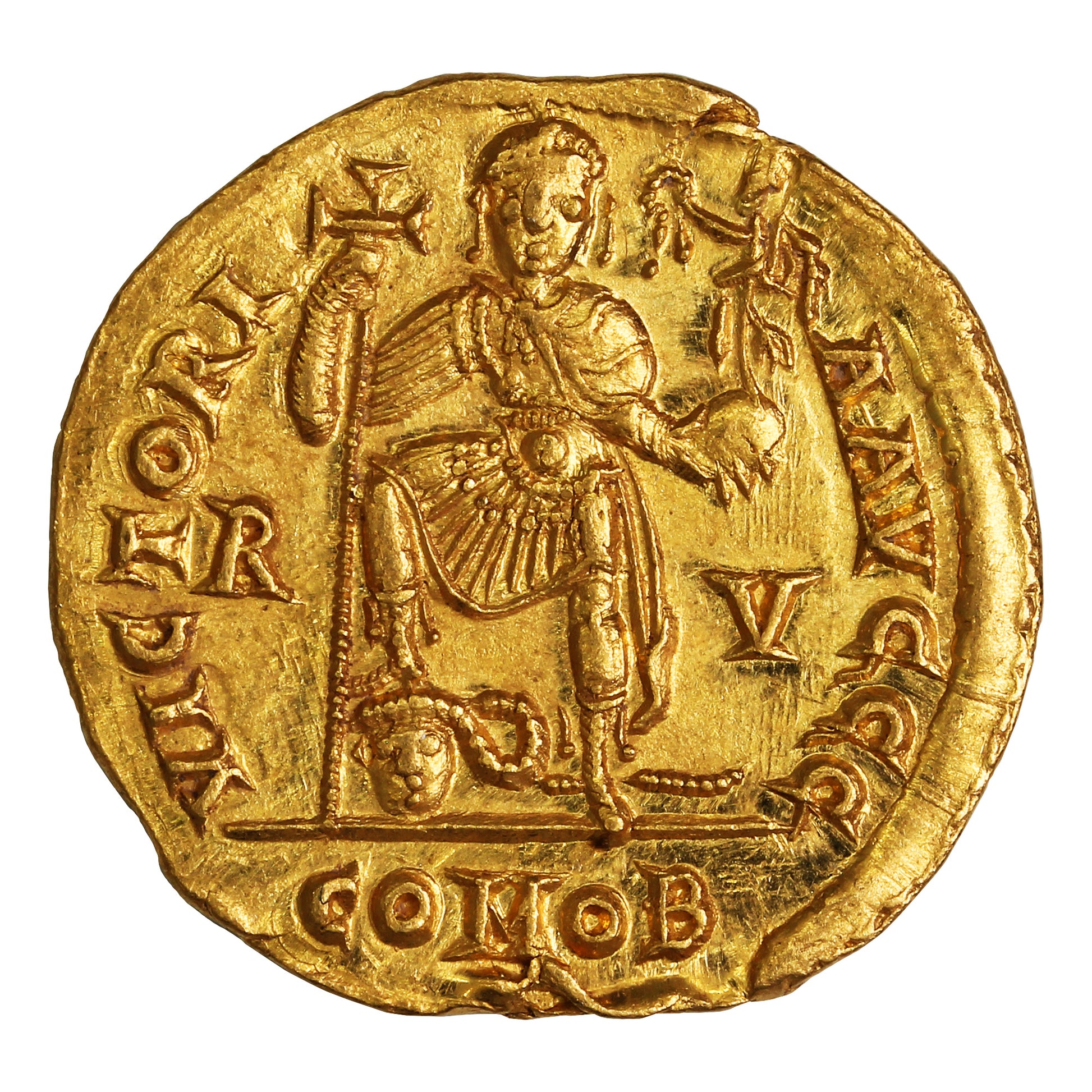 Valentinian III standing facing right, holding a vexillum in one hand and Victory atop a globe in the other, foot resting on the head of a human-headed coiled serpent, with the legend around, and the mint mark divided by the Emperor.