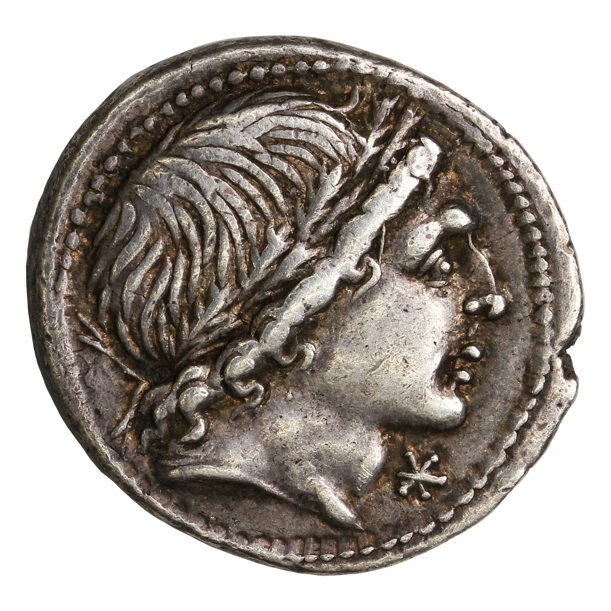 Obverse: The head of a young male (possibly Apollo) facing right, wearing an oak-wreath, with the value mark below the chin, surrounded by a border of dots.