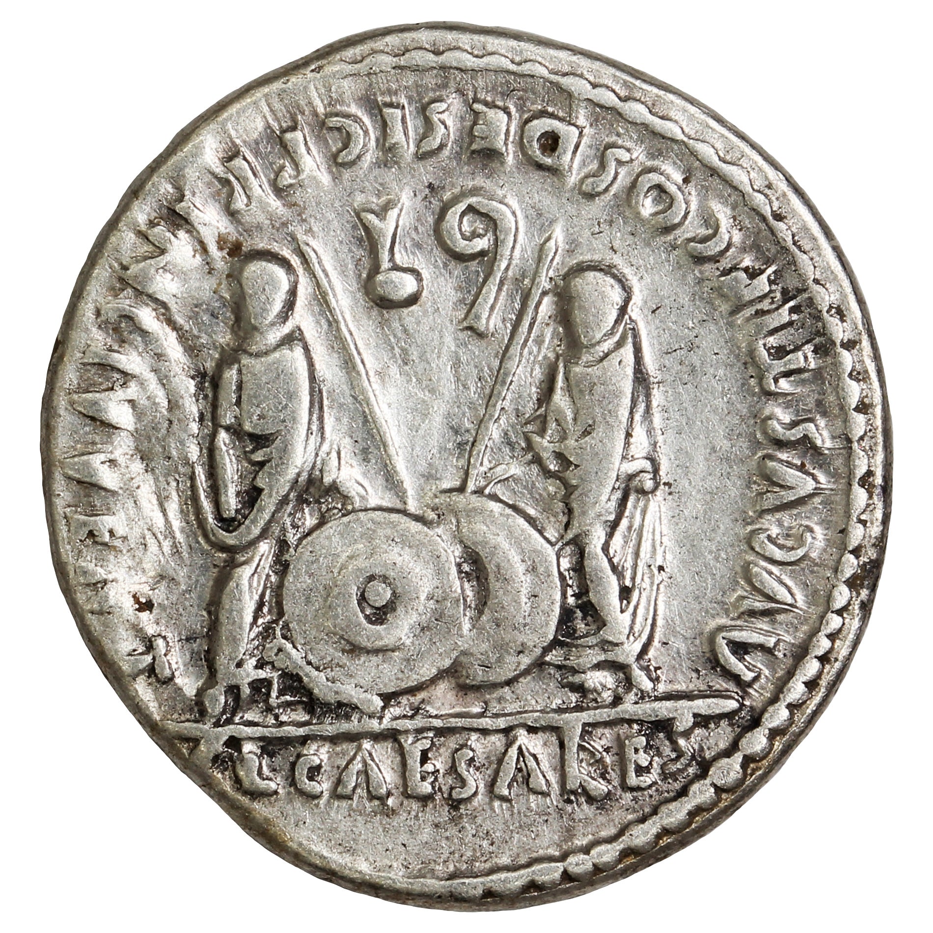 Reverse: Gaius and Lucius Caesar standing facing each other, togate, resting their hands on a shield and spear, simpulum right, and lituus left, with legend around.