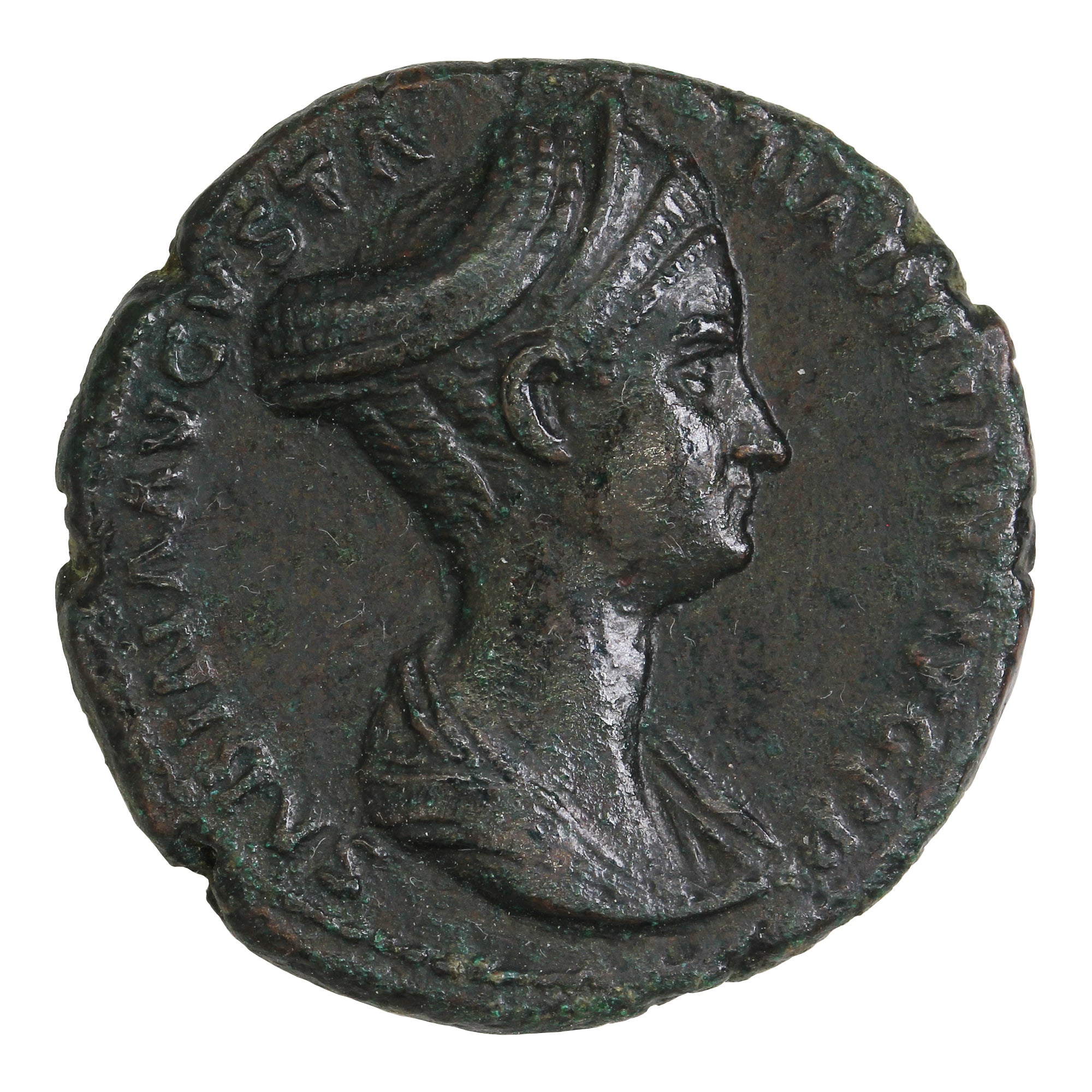 Obverse: Draped bust of Sabina, with braided and piled hair, facing right.