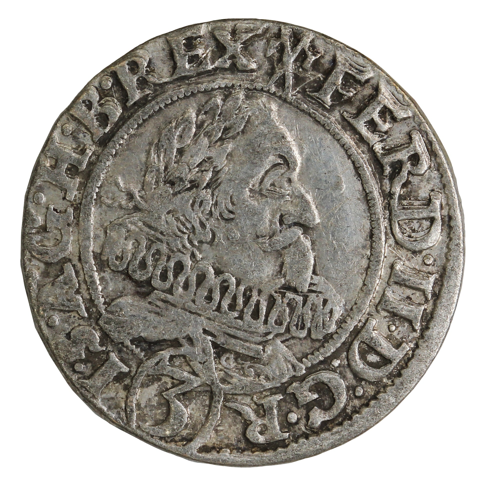 Obverse: Portrait of Ferdinand II facing right, wearing a frilly collar, with the legend around, and denomination in a circle dividing the legend.