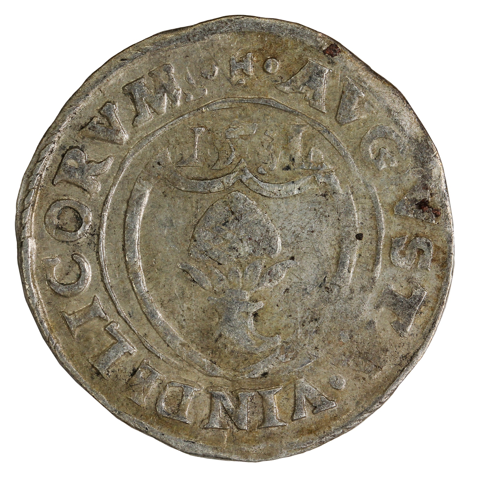 Obverse: The arms of the City of Ausburg in a heart-shaped shield, with the legend around and the date below.