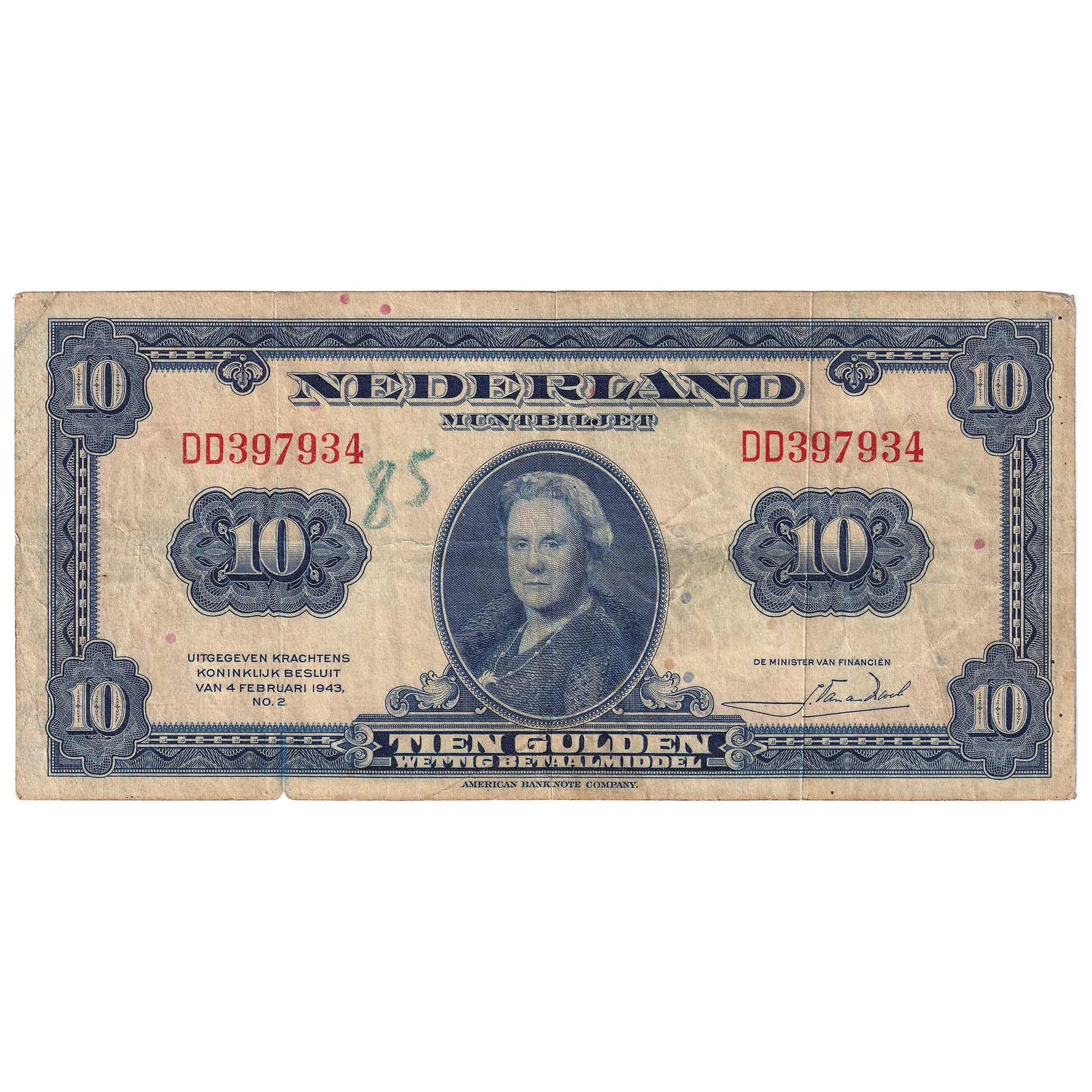 Netherlands 1943 10 Gulden Note, Pick #66a, VF (writing)