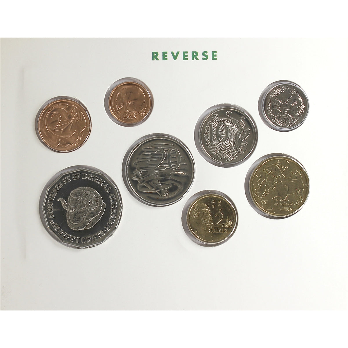 Australia 1991 8-coin Uncirculated Set with Commemorative 50-cents in Folder (Light wear on sleeve). The 50-cent piece marks the 25th Anniversary of Decimal Currency in Australia. This is also the last date for the 1- and 2-cent coins: a landmark year. Look out for other sets appearing in date order over the next couple weeks!