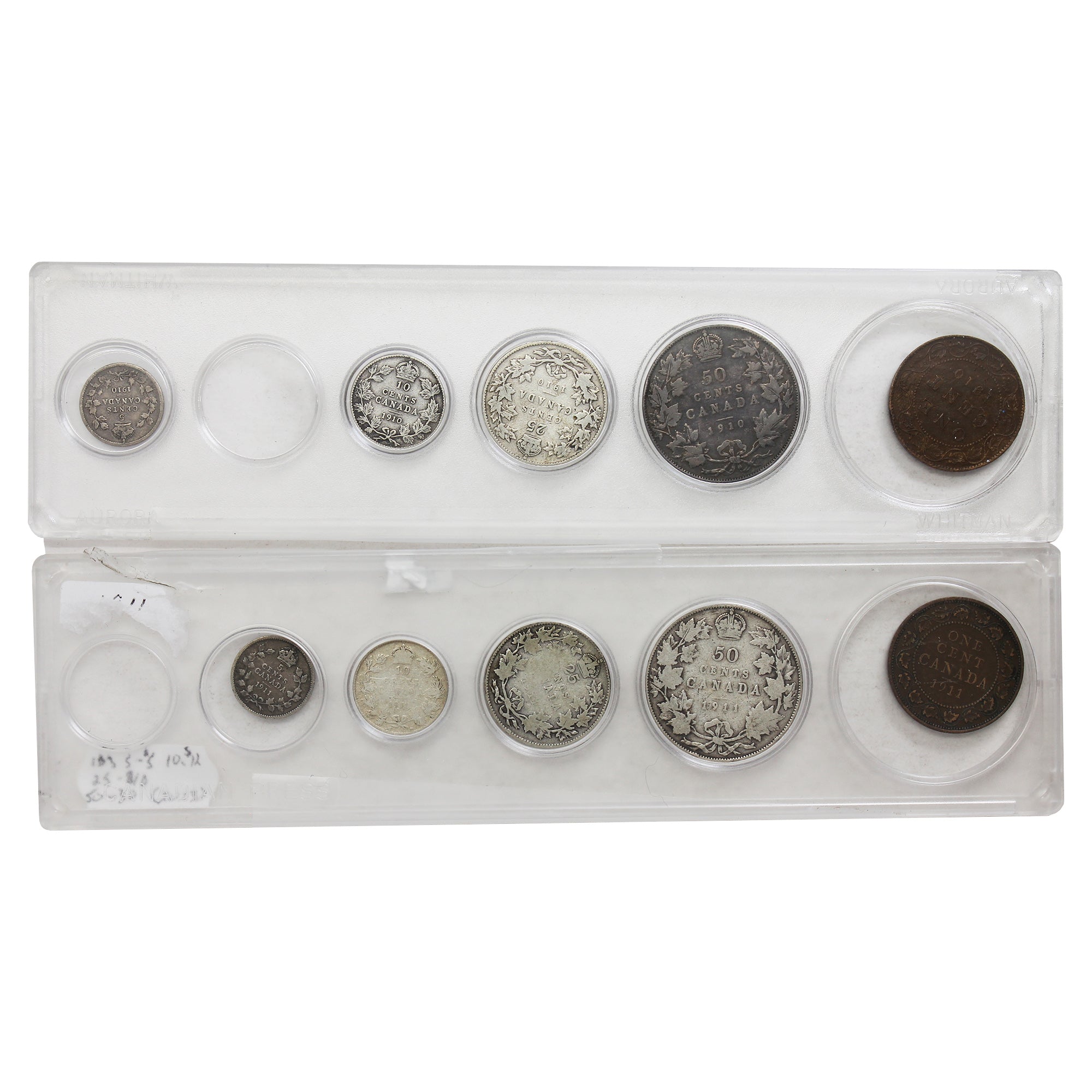 This lot features a pair of Canada Year Sets from 1910 and 1911, each housed in a snaplock case holder. Each set contains 5 circulated coins representing their respective year. Please note that some of the coins may show toning and/or scratches.