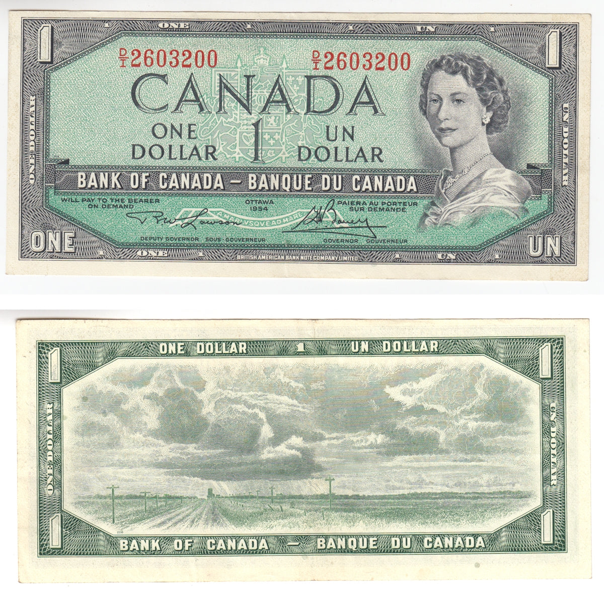 Due to the sudden death of King George VI in 1952, The Bank of Canada prepared the Canadian Landscape Series to be released in 1954. Unlike the design of its predecessors, the 1954 issued notes featured Queen Elizabeth II on the right side of the note - a tactical way to prevent folding in the center of the note. Additionally, the reverse of the note was now replaced with various landscapes around Canada.