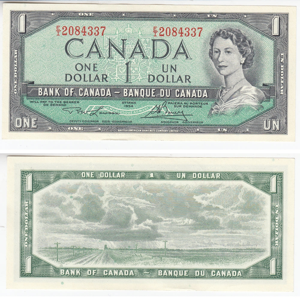 Due to the sudden death of King George VI in 1952, The Bank of Canada prepared the Canadian Landscape Series to be released in 1954. Unlike the design of its predecessors, the 1954 issued notes featured Queen Elizabeth II on the right side of the note - a tactical way to prevent folding in the center of the note. Additionally, the reverse of the note was now replaced with various landscapes around Canada.