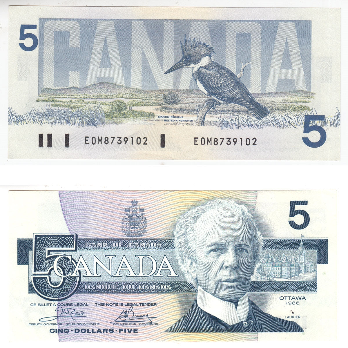 BC-56a-i 1986 Canada $5 Crow-Bouey, EOM, AU-UNC