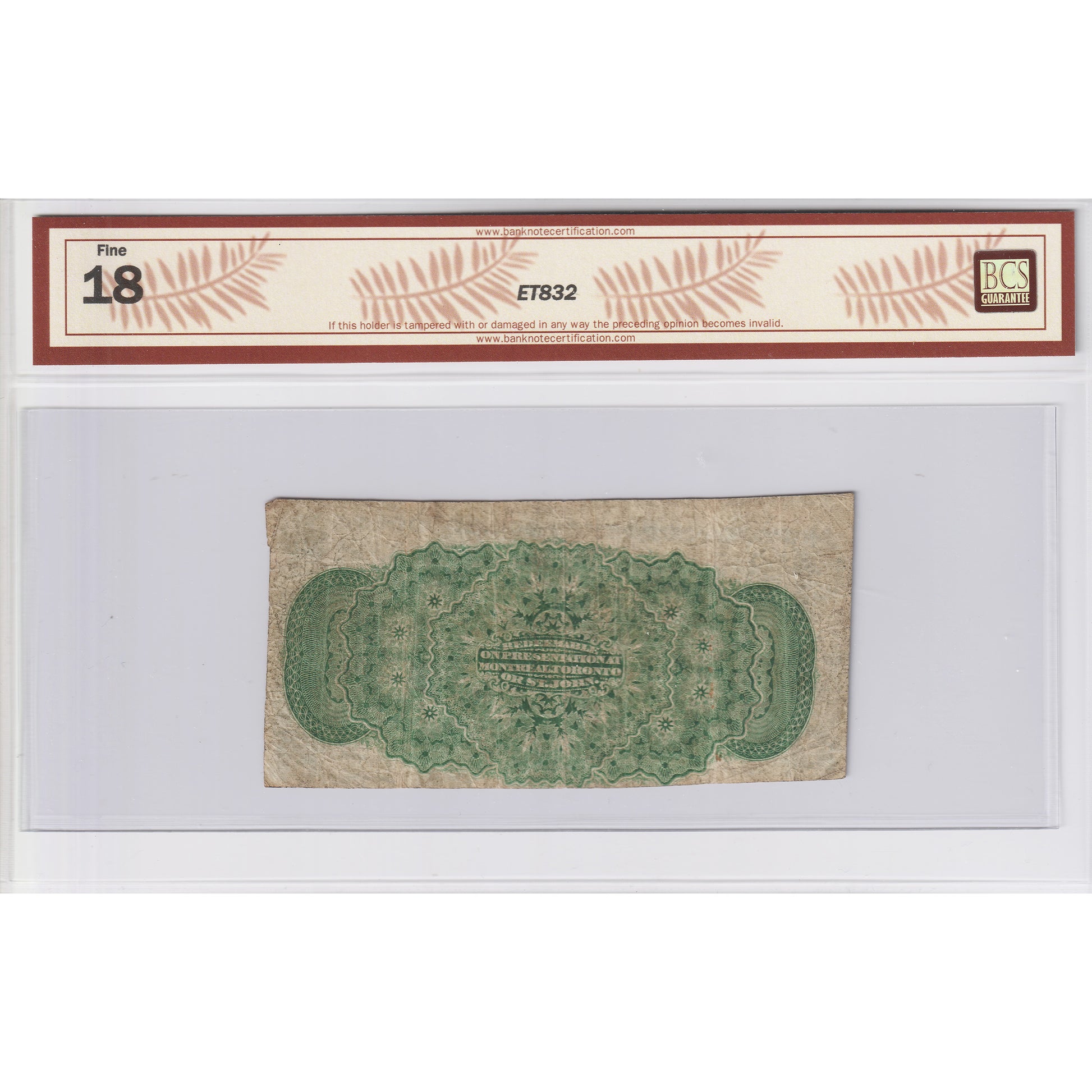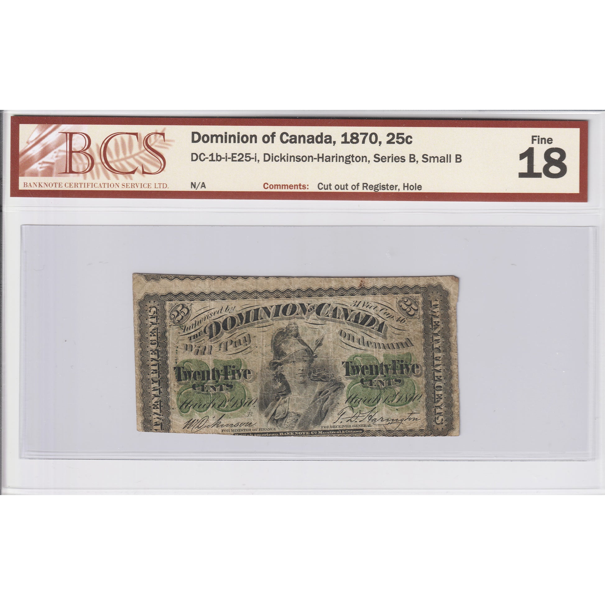 DC-1b-i-E25-i 1870 Dominion 25-cent Shinplaster, Dickinson-Harington, Series B, Small B, BCS Certified F-18 (Cut out of register, Hole)