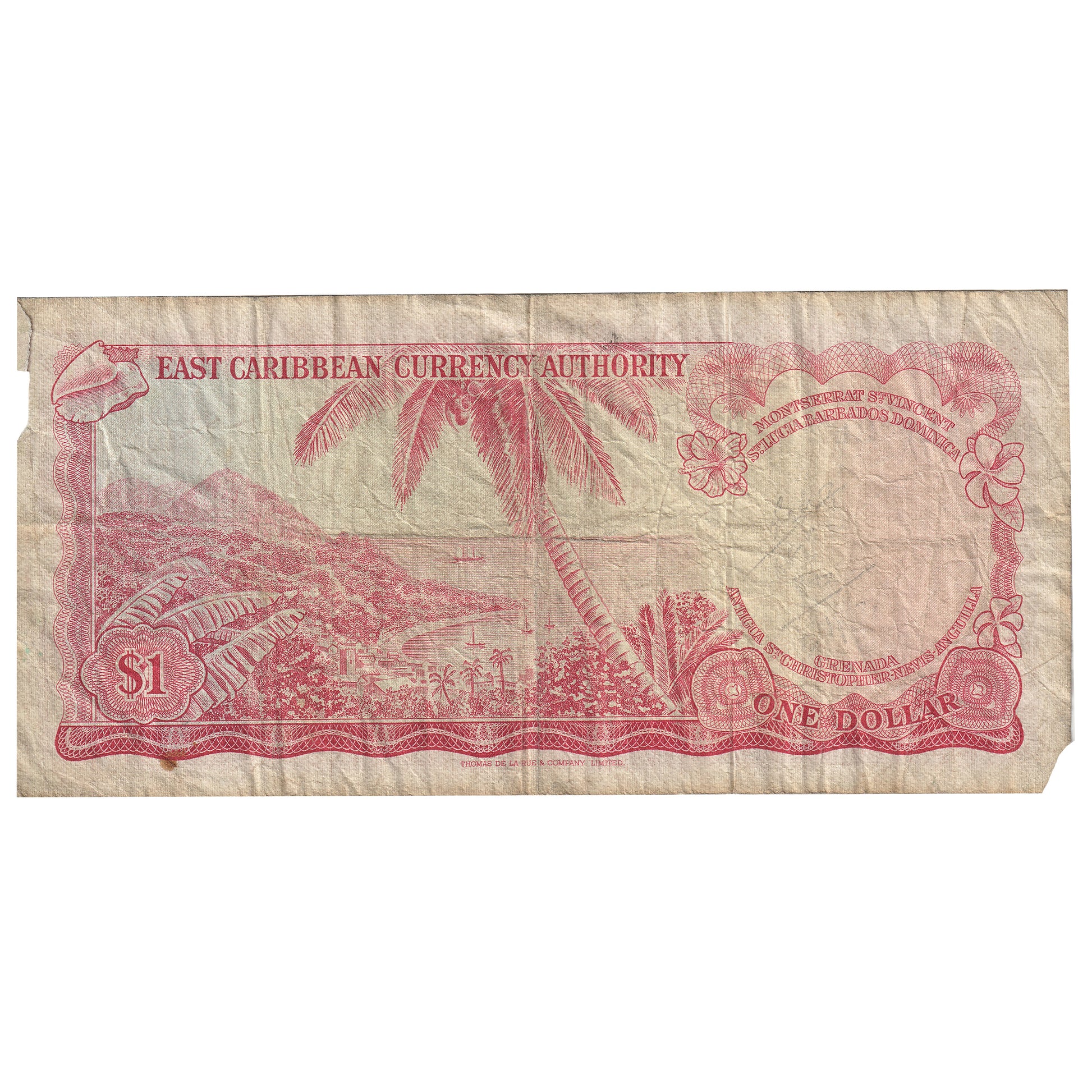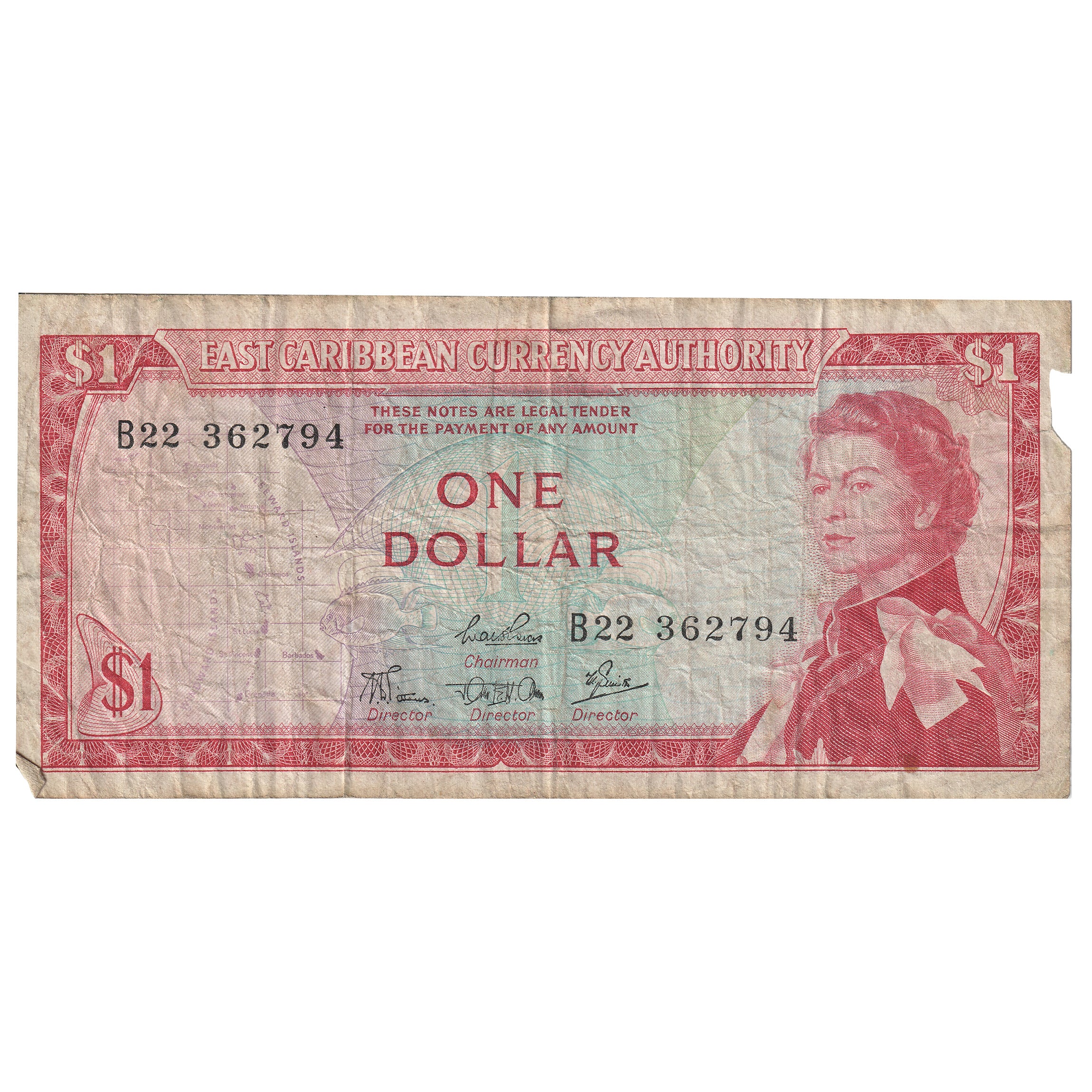East Caribbean States 1965 1 Dollar Note, Sign 4, Pick #13c Circ (Tear)