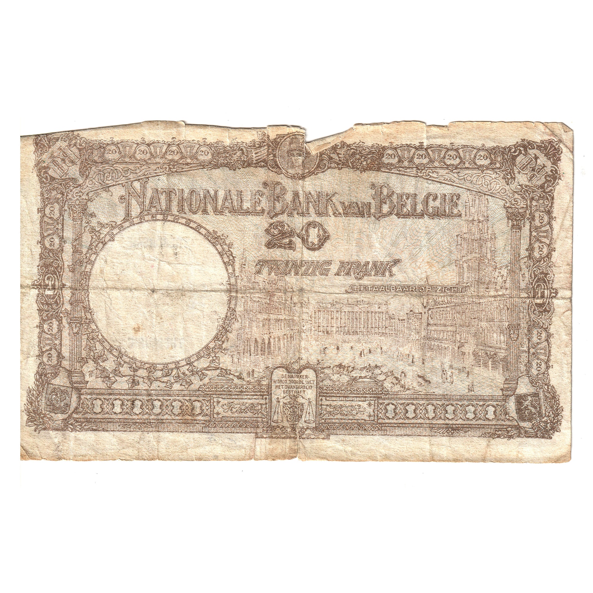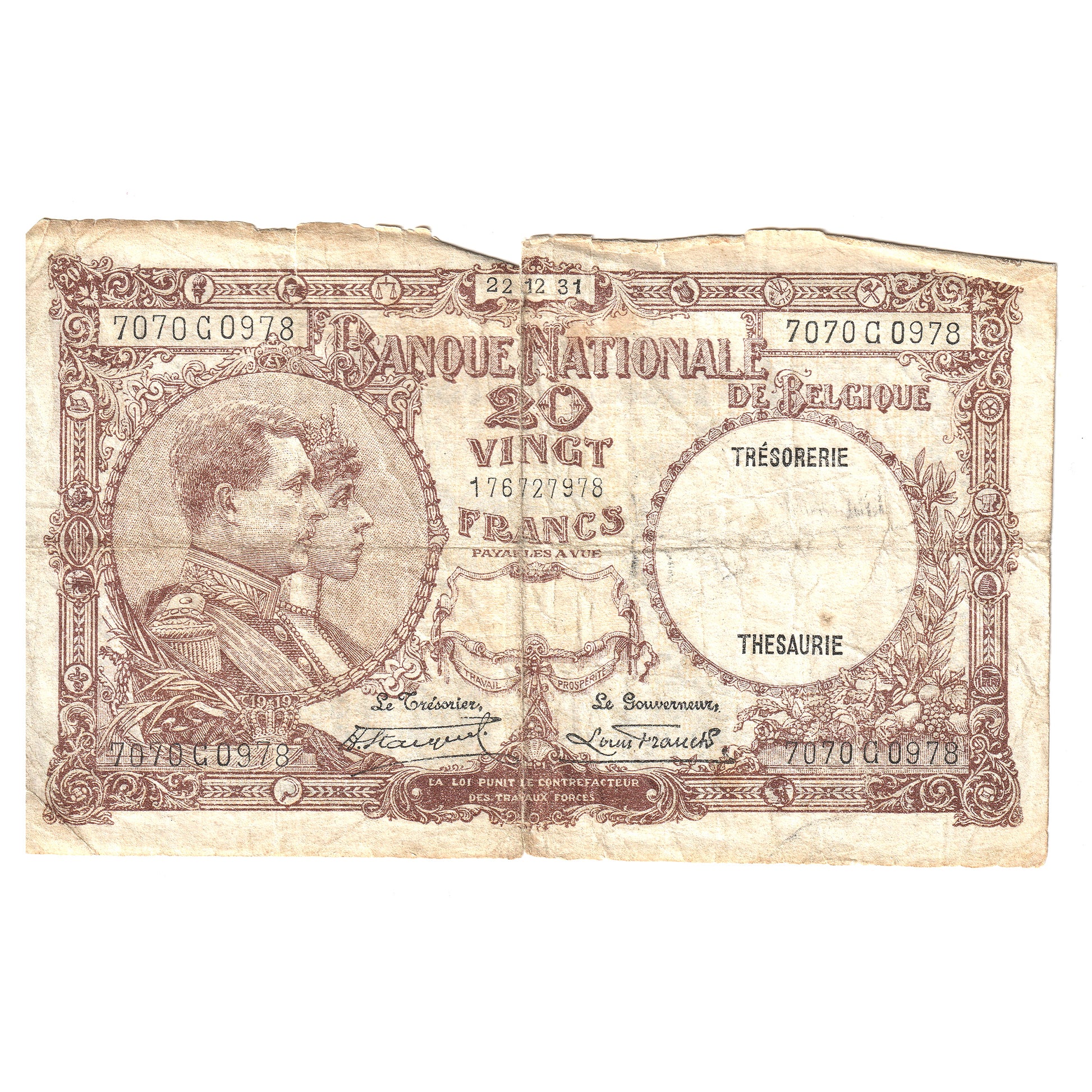 Belgium 1931 20 Franc Note, Pick #98b F (Tears)
