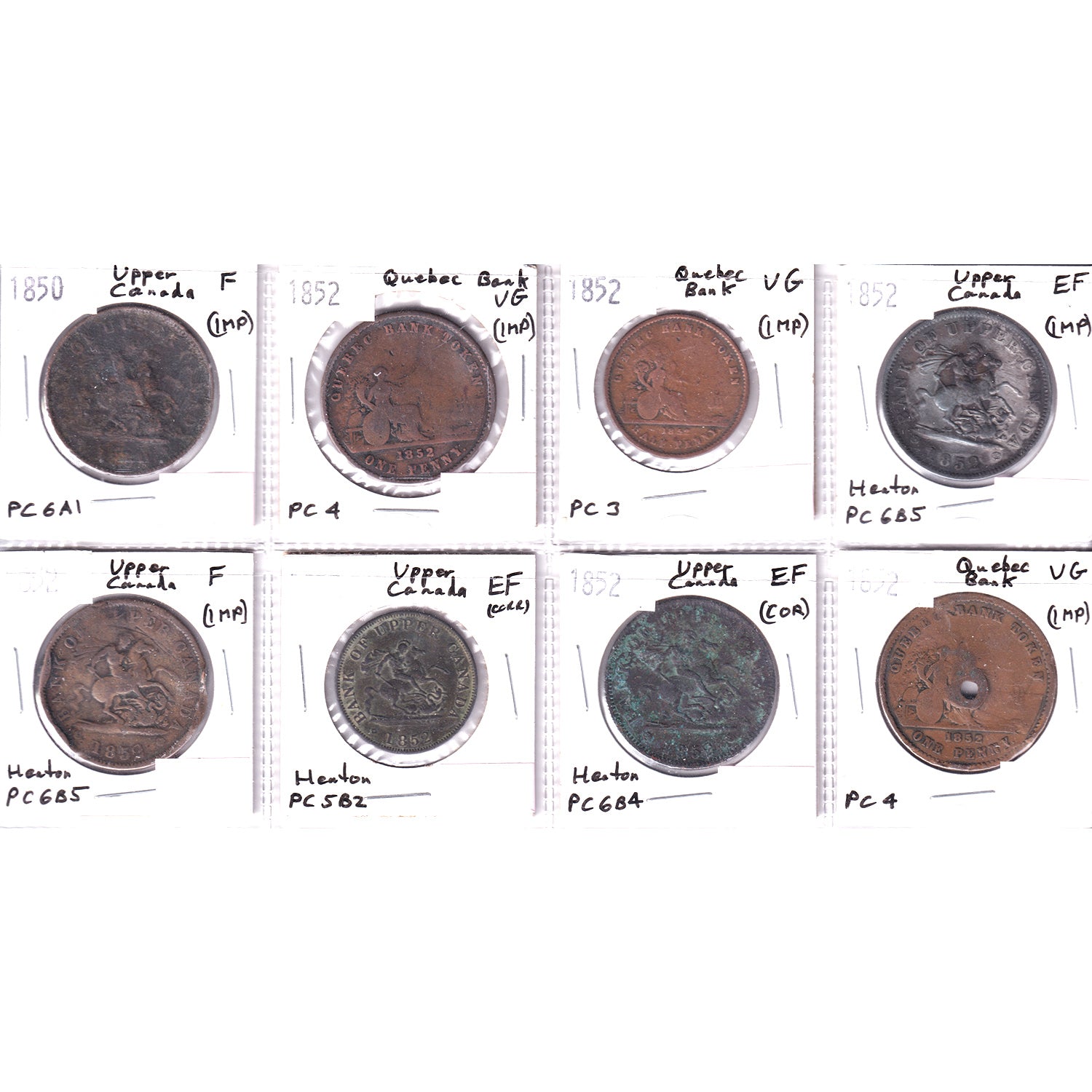 lot of 8x 1850-1852 PC Upper Canada & Quebec Bank Tokens Fine to Extra Fine (Impaired)