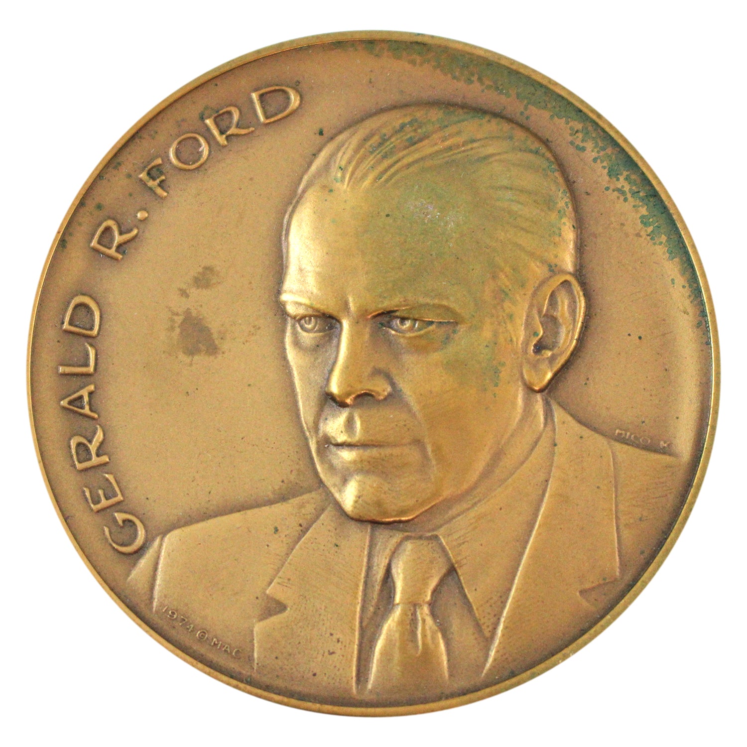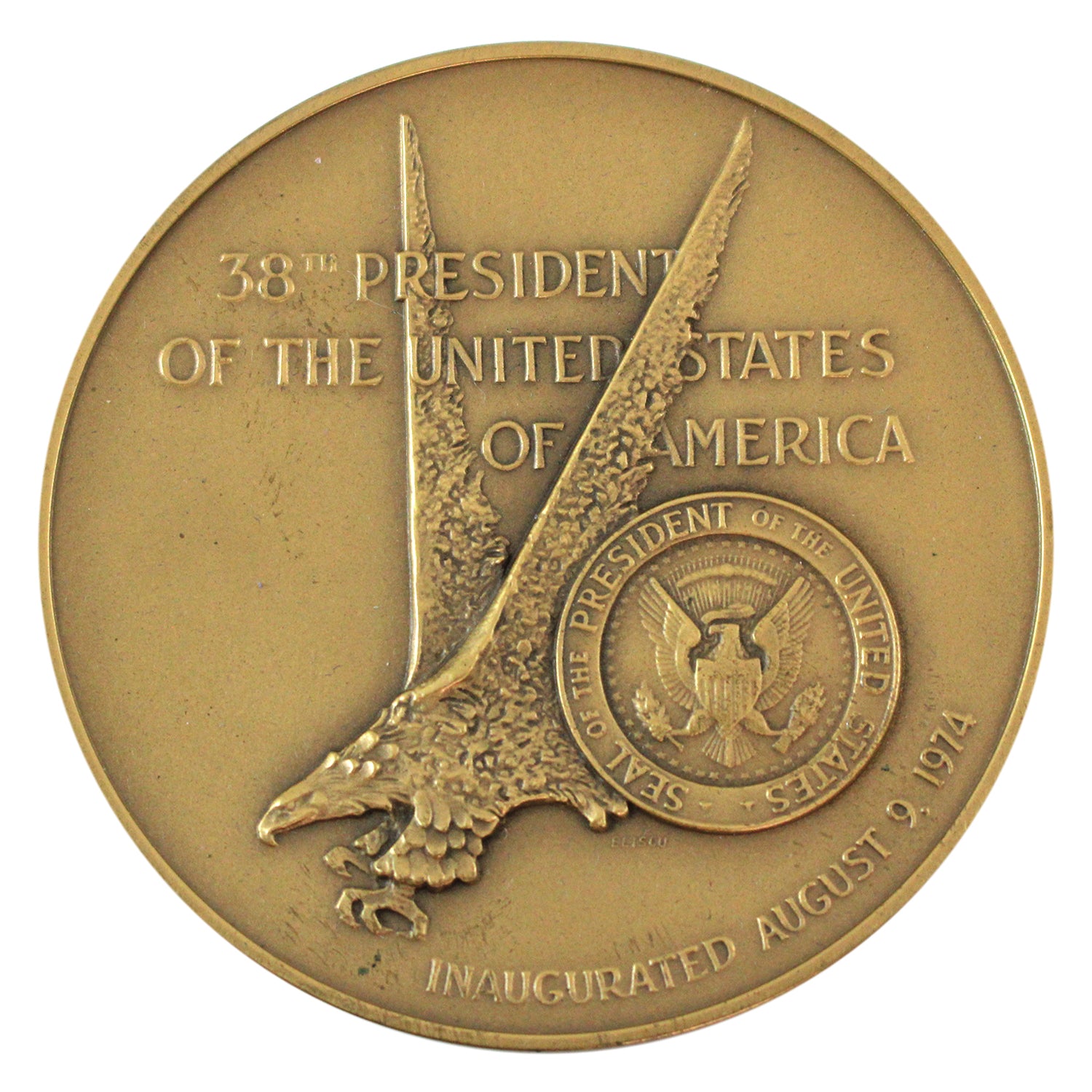 This medal commemorates a remarkable moment in American history. Just eight months after becoming Vice President following Spiro Agnew's resignation, Gerald Ford ascended to the presidency when Richard Nixon stepped down. Notably, Ford was the first U.S. President to take office without being formally elected by the public. The medal features an antique bronze patina finish and measures 2.75 inches in diameter and 1/4 inch thick. The obverse displays a profile of Mr. Ford facing left, while the reverse showcases an eagle with its claws extended and wings forming a V, with the Presidential seal superimposed.