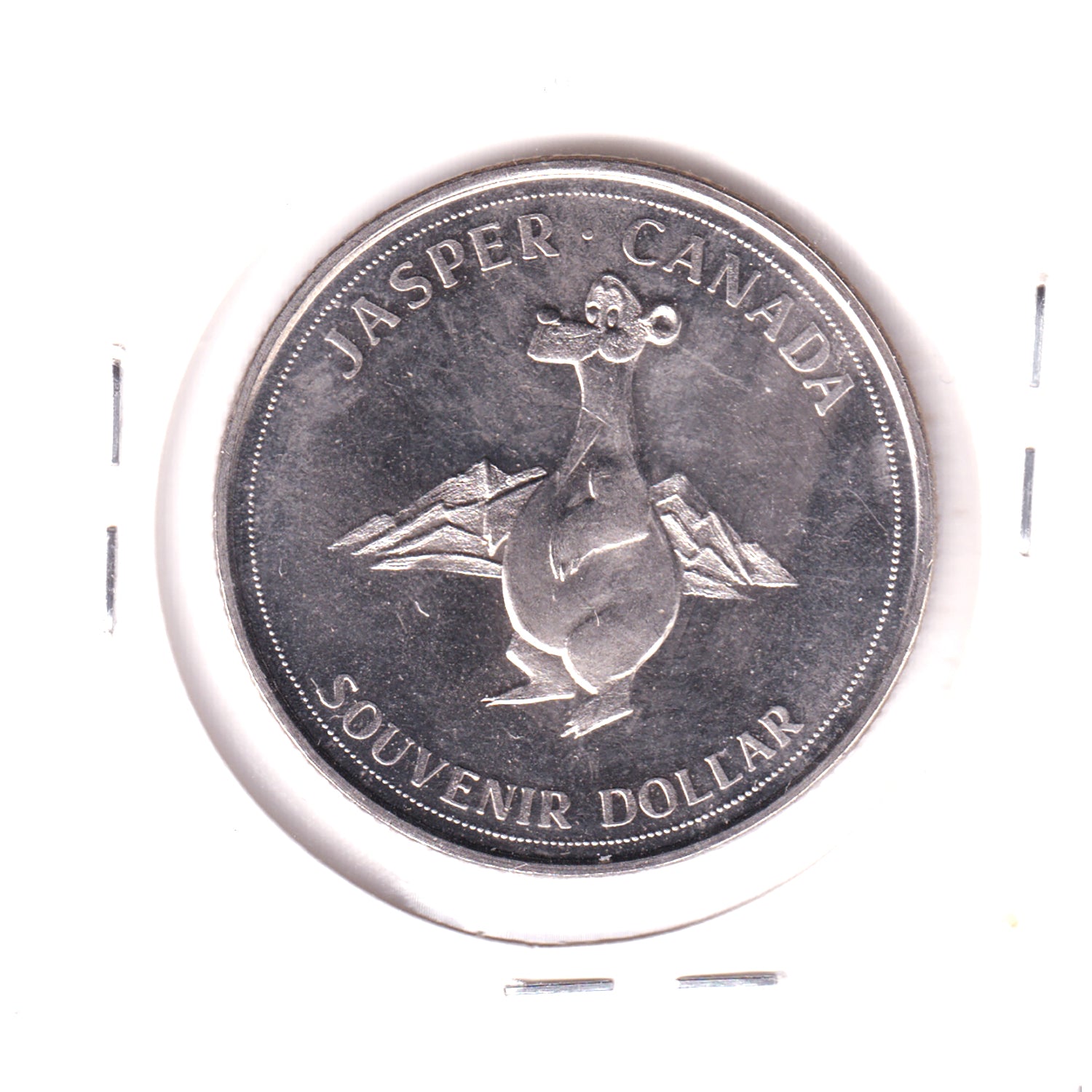 This commemorative token celebrates the 60th Anniversary of the Railway through Jasper National Park. The obverse features a classic steam locomotive heading right, accompanied by a modern CN Rail train moving left, with the dates "1912" and "1972" prominently displayed. The inscription reads "SIXTY YEARS OF RAIL THROUGH JASPER NATIONAL PARK." On the reverse, Jasper the Bear stands proudly in front of a mountain backdrop, with "JASPER • CANADA" above and "SOUVENIR DOLLAR" below. This token serves as a delightful reminder of Jasper's rich railway history and it's stunning natural beauty.