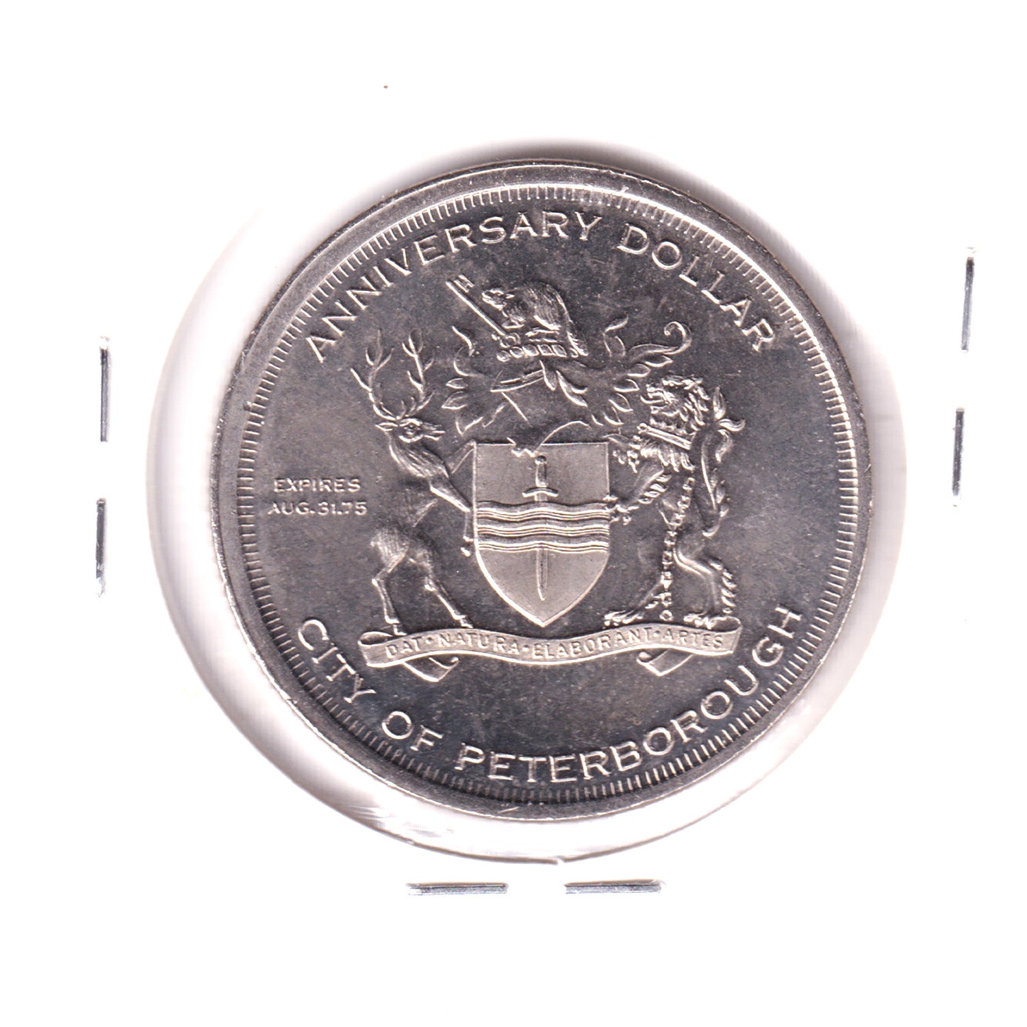 Celebrate the history of Peterborough, Ontario with this 1975 Anniversary Dollar Token. Commemorating a significant milestone for the city, this token features unique designs symbolizing the local heritage and community pride. A must-have for collectors of Canadian commemorative tokens, regional memorabilia, or fans of Peterborough’s rich history. Add this historic piece to your collection today!