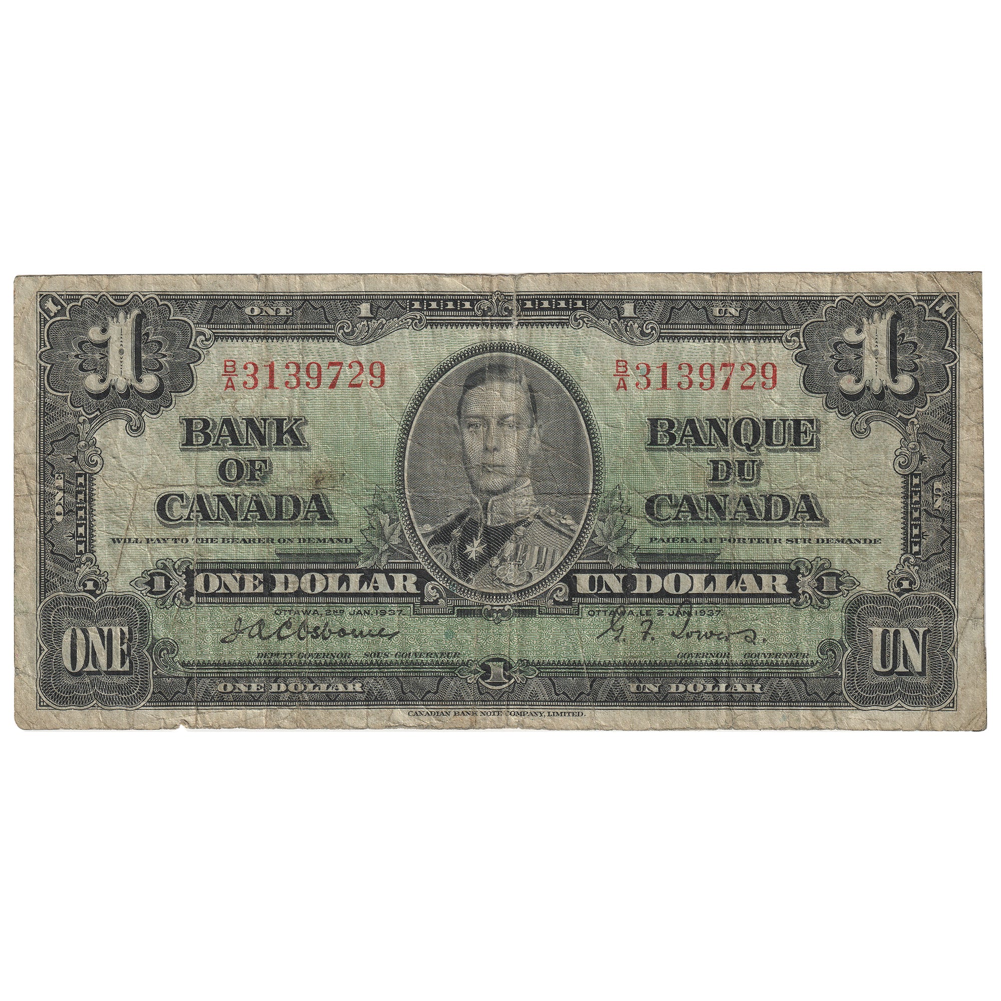 BC-21a 1937 Canada $1 Osborne-Towers, B/A, VG-F (Tear)