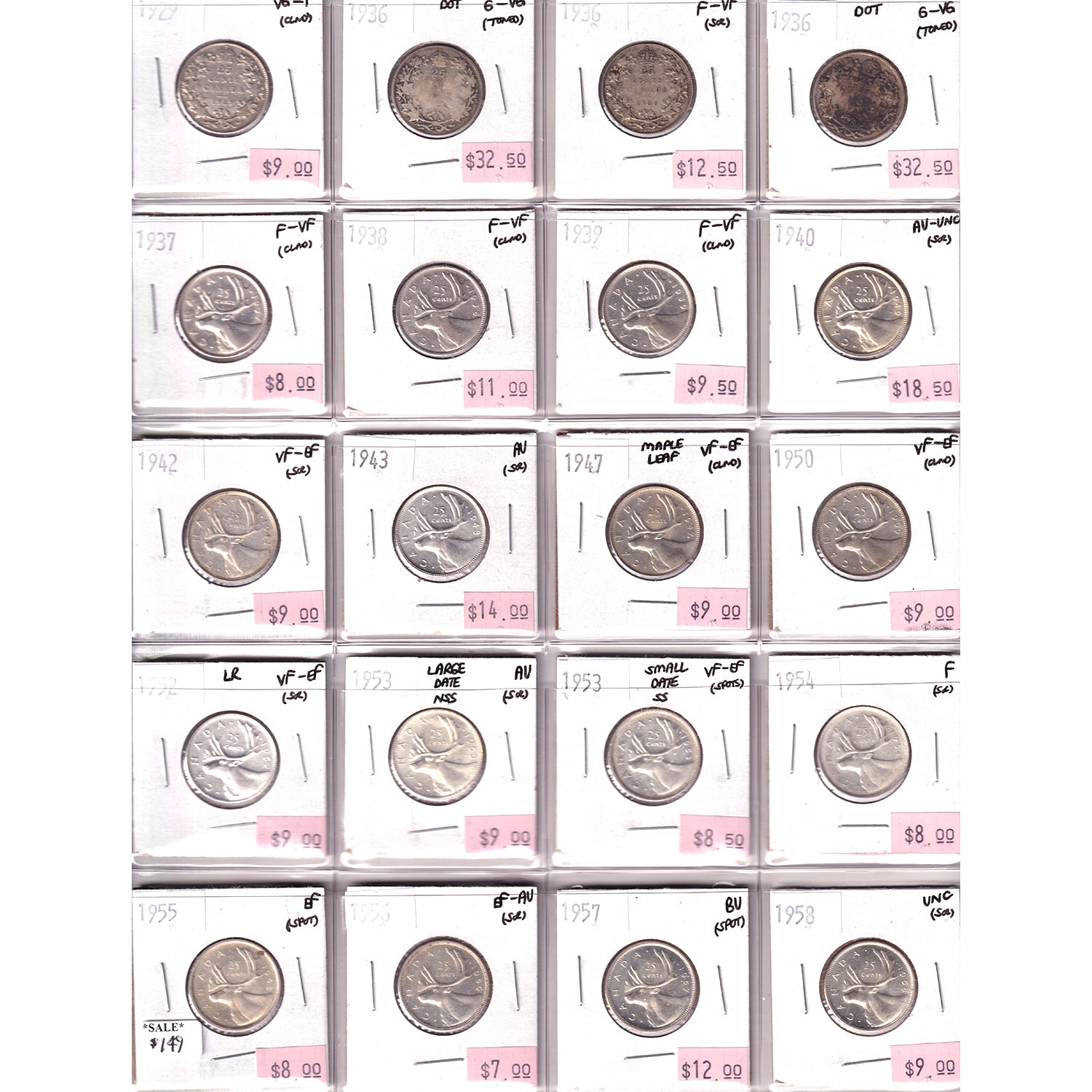 Lot of 20x 1929-1958 Canada 25-Cents VG-F to BU, 25Pcs (Impaired)