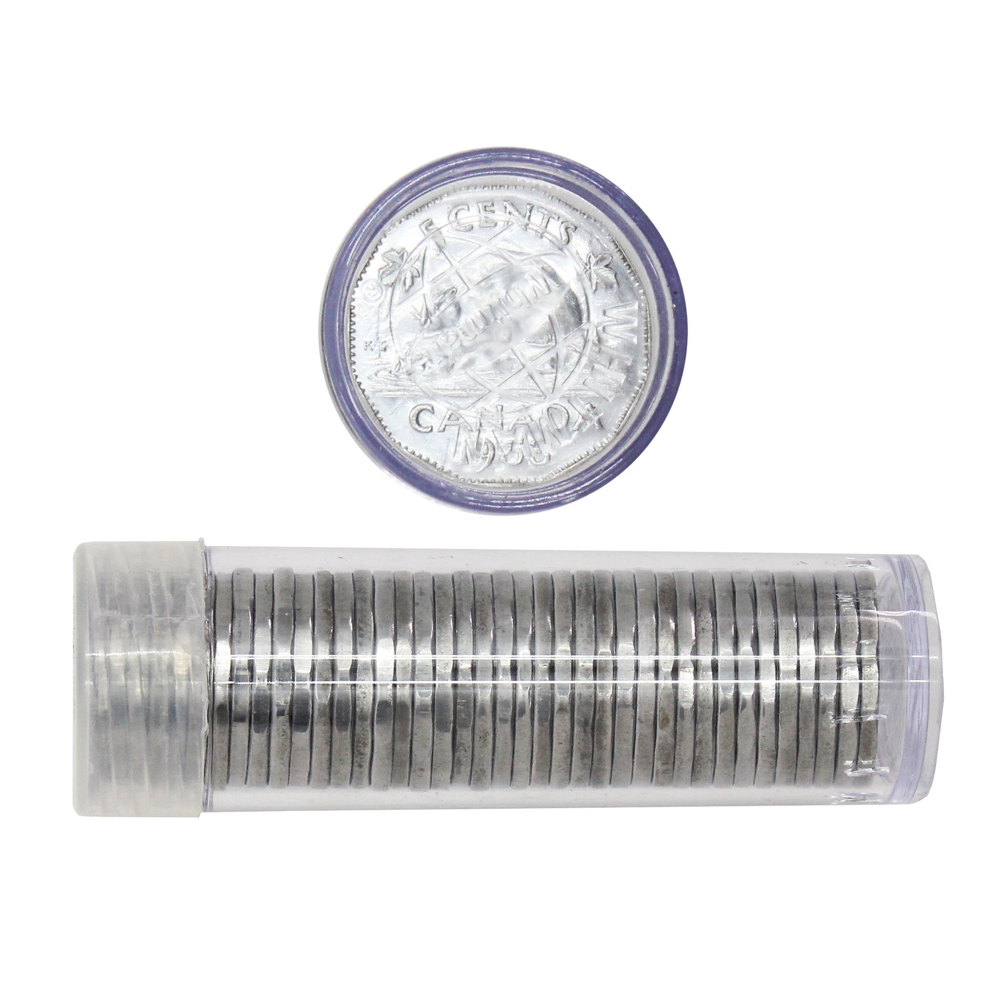 This lot features 39 Canada 5-cent coins from 1953 in mint state condition and are housed in tube roll.