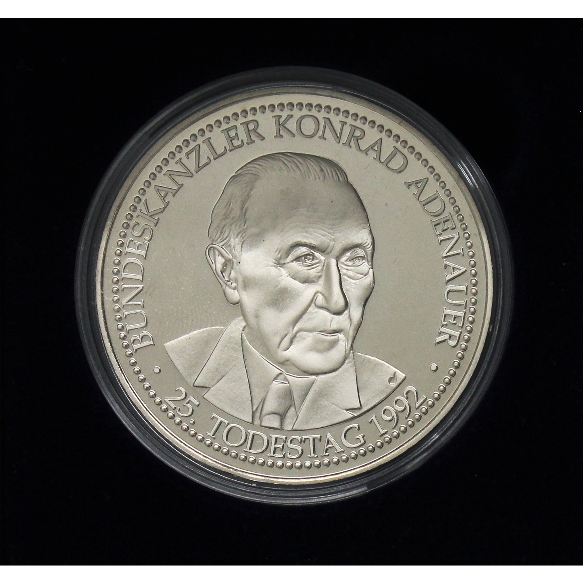 Germany 1992 Medallion in Case: 25th Anniversary of Chancellor Konrad Adenauer's Death. The medallion has lots of scratches and minor toning; the capsule has a few scratches. Includes CoA in German.