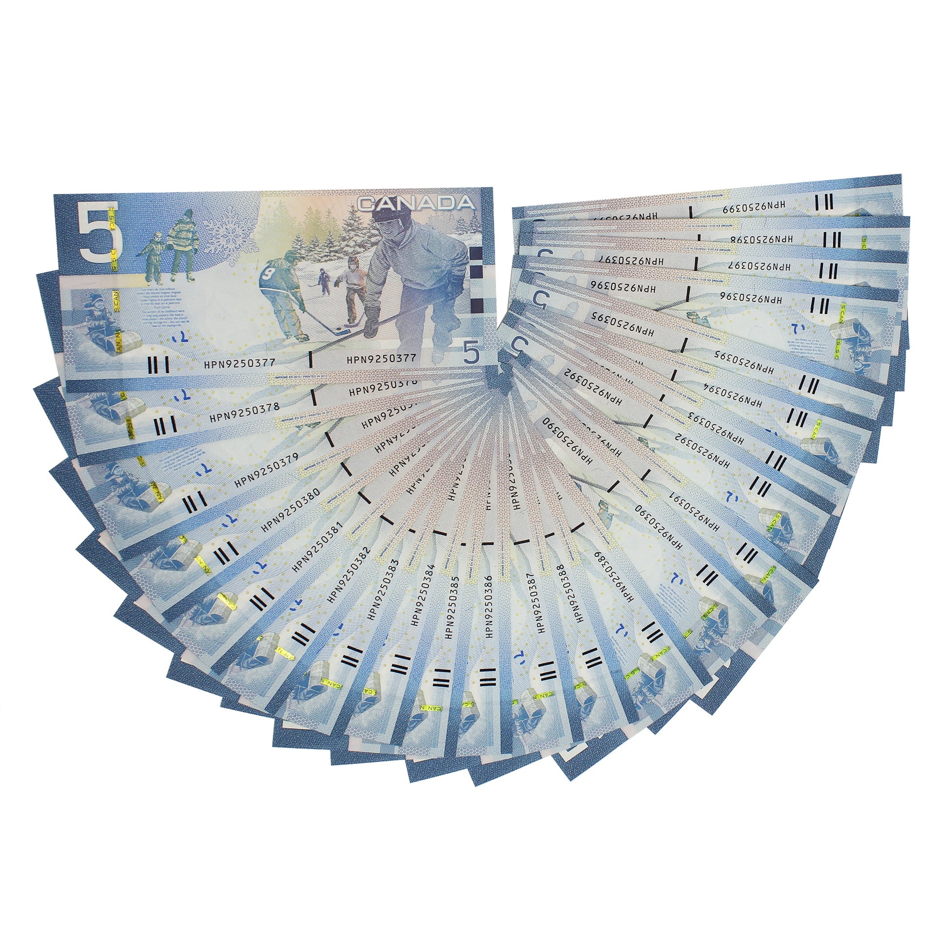 Lot of 23x Sequential 2010 Canada $5 Notes, Jenkins-Carney, HPN, Appear ~UNC or Better, 23Pcs. The sequence runs from HPN9250377 to -399.