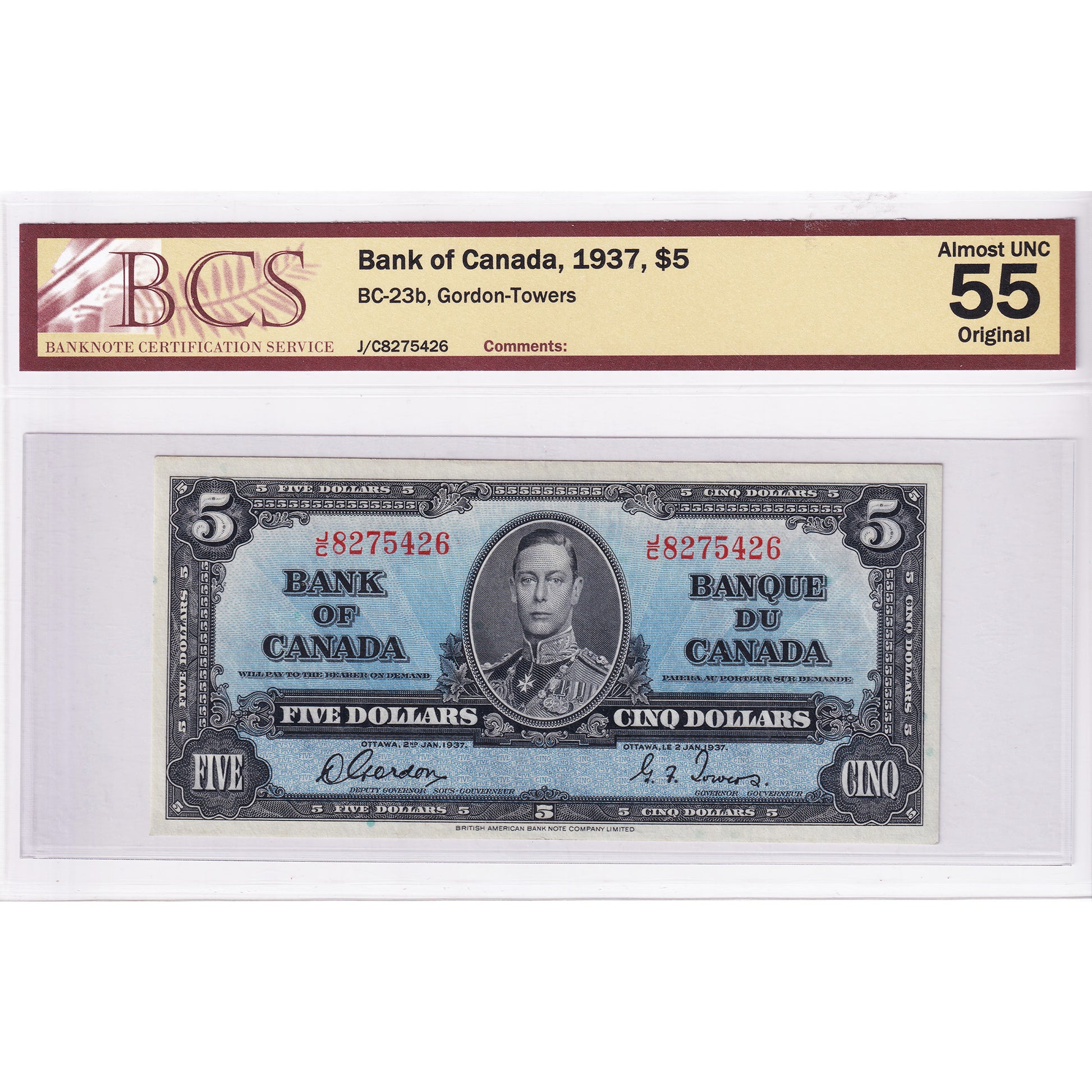 BC-23b 1937 Canada $5 Gordon-Towers, J/C BCS Certified AU55 Original