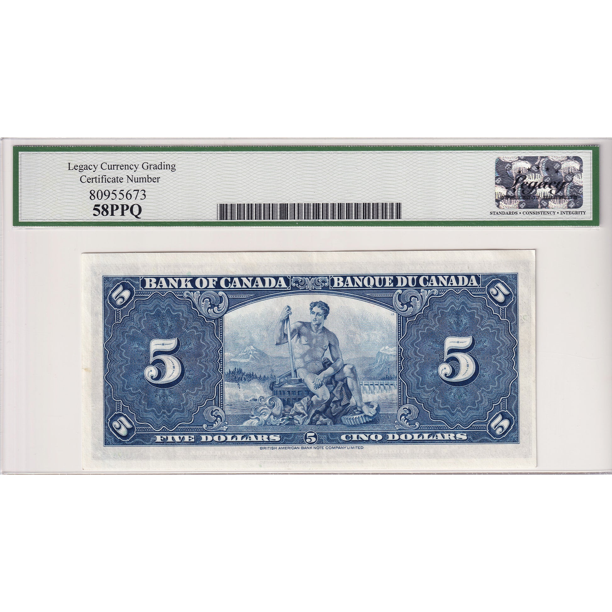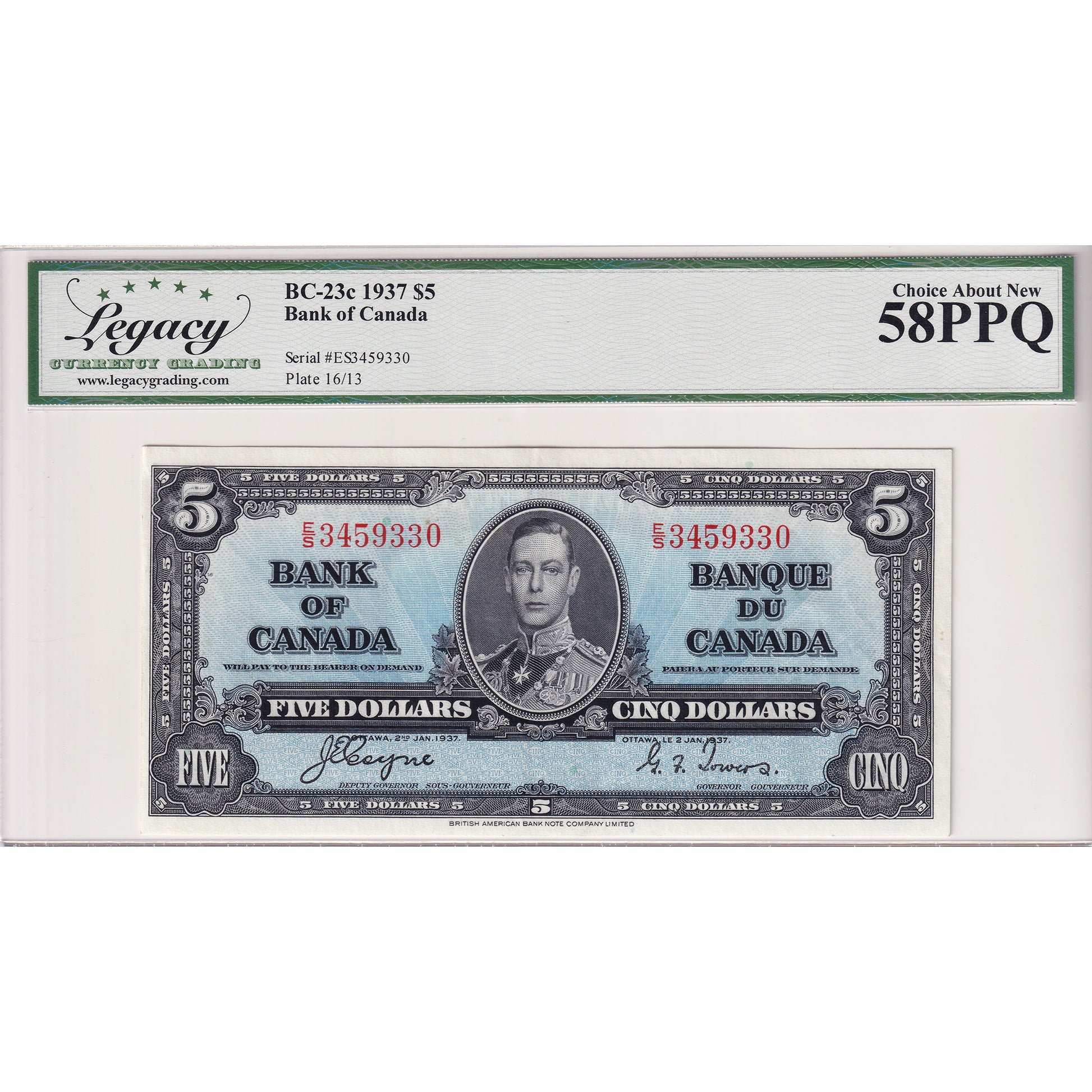 BC-23c 1937 Canada $5 Coyne-Towers, E/S Legacy Certified AU-58 PPQ