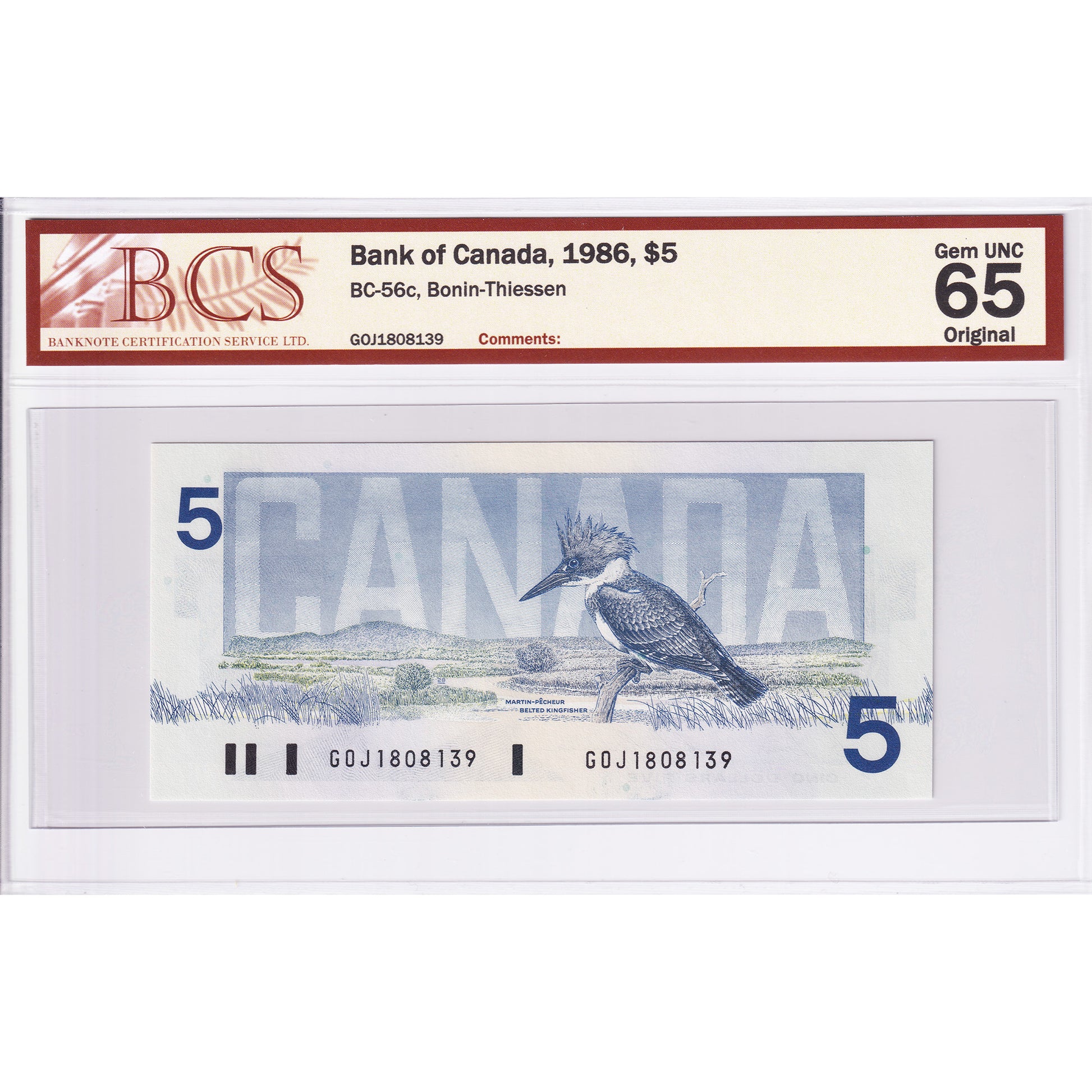 BC-56c 1986 Canada $5 Bonin-Thiessen, GOJ BCS Certified GUNC65 Original