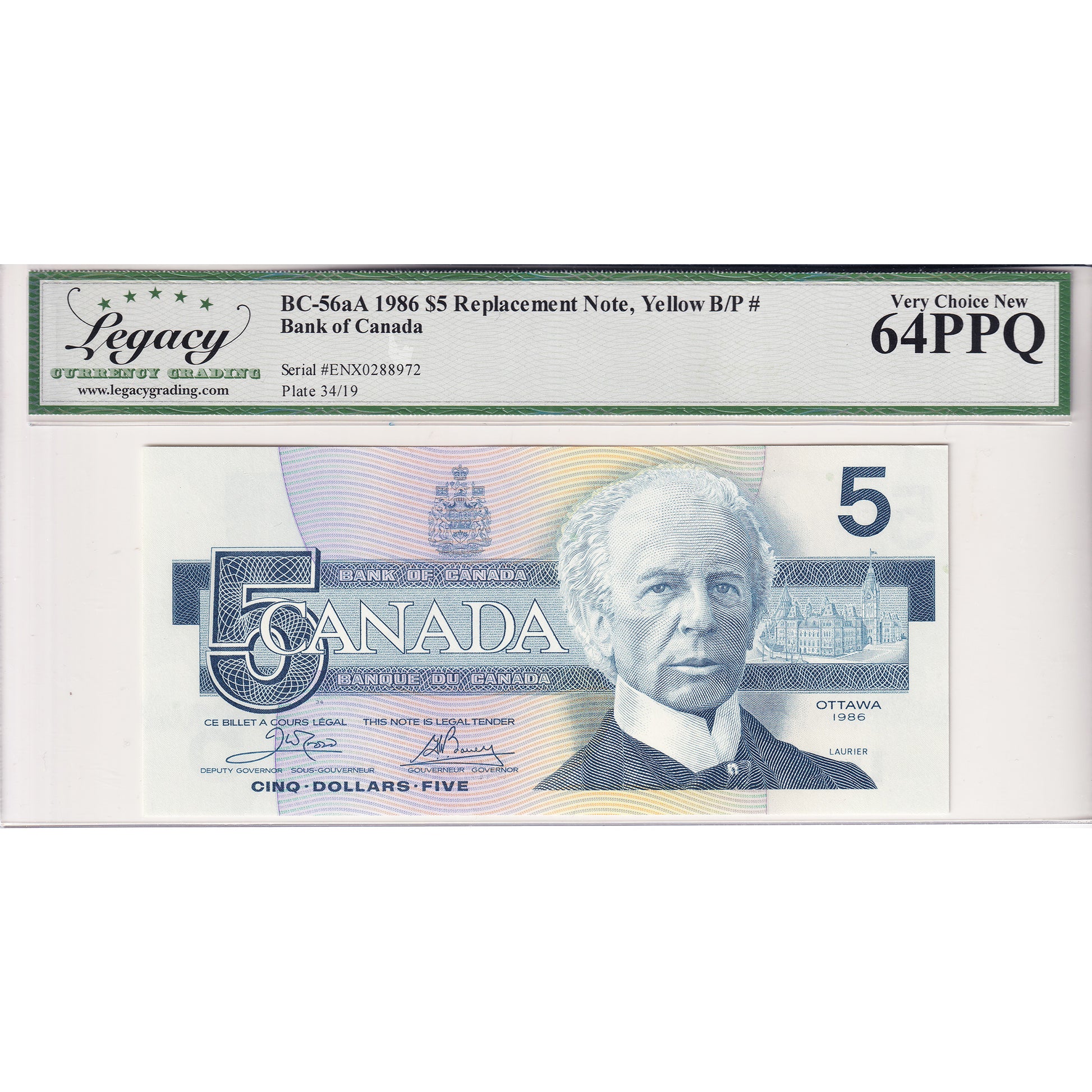 BC-56aA 1986 Canada $5 Crow-Bouey, Replacement, ENX With Yellow Back Position Number Legacy Certified CUNC-64 PPQ