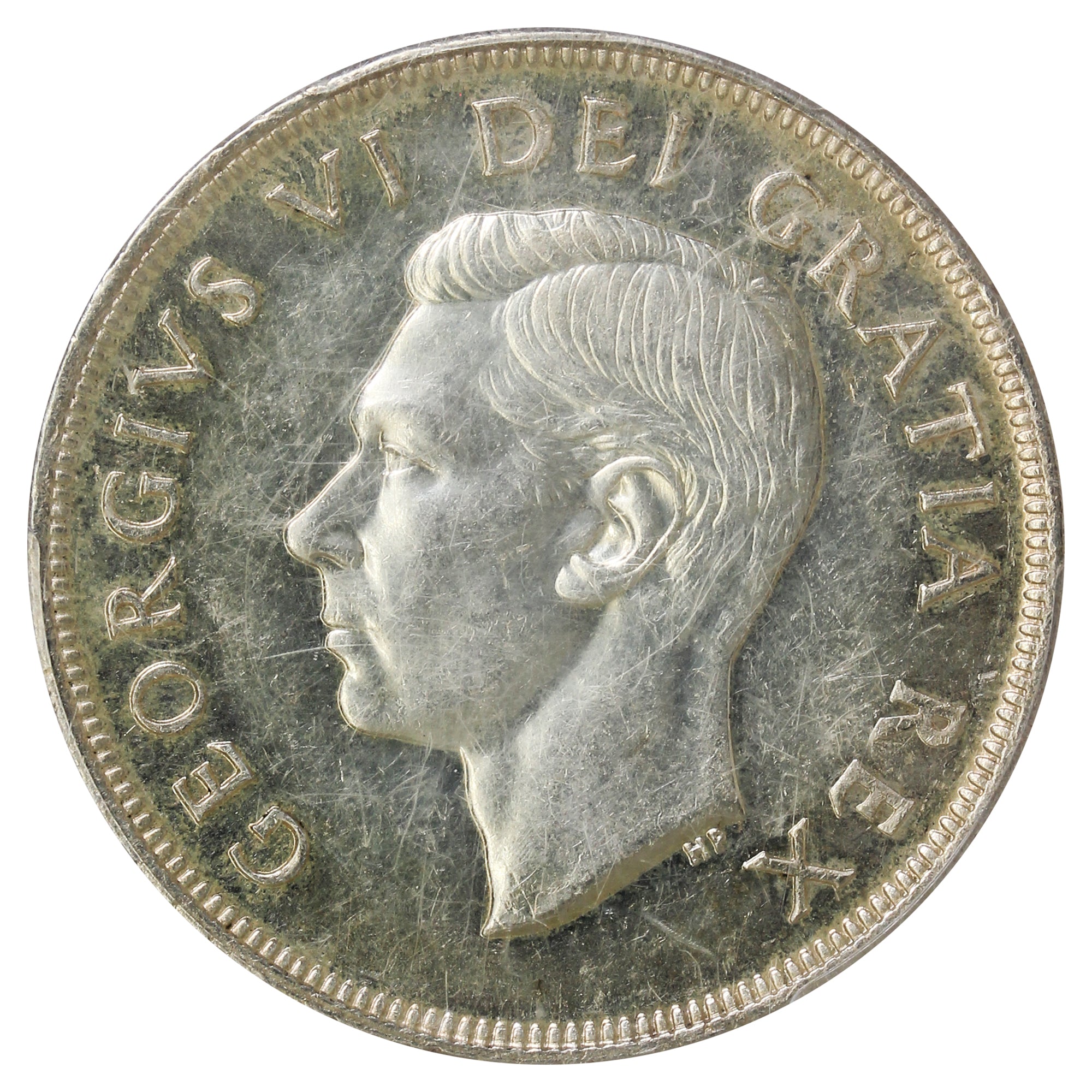 Since 1937, when King George VI began appearing on Canadian currency, the obverse of Canadian Silver Dollars bore the inscription "GEORGIVS VI D:G:REX ET IND:IMP", which is the abbreviation for the Latin phrase "George VI Dei Gratia Rex et Indiae Imperator" or "George VI By the Grace of God King and Emperor of India". On August 15, 1947, India became a fully independent nation, which meant that the legend on all denominations of Canadian decimal currency had to be updated. But, by 1948, the new dies reflecting India's independence had not yet been prepared, so production of the 1947 coinage continued into 1948 with a maple leaf engraved next to the 7 to distinguish it from the actual 1947 coinage.