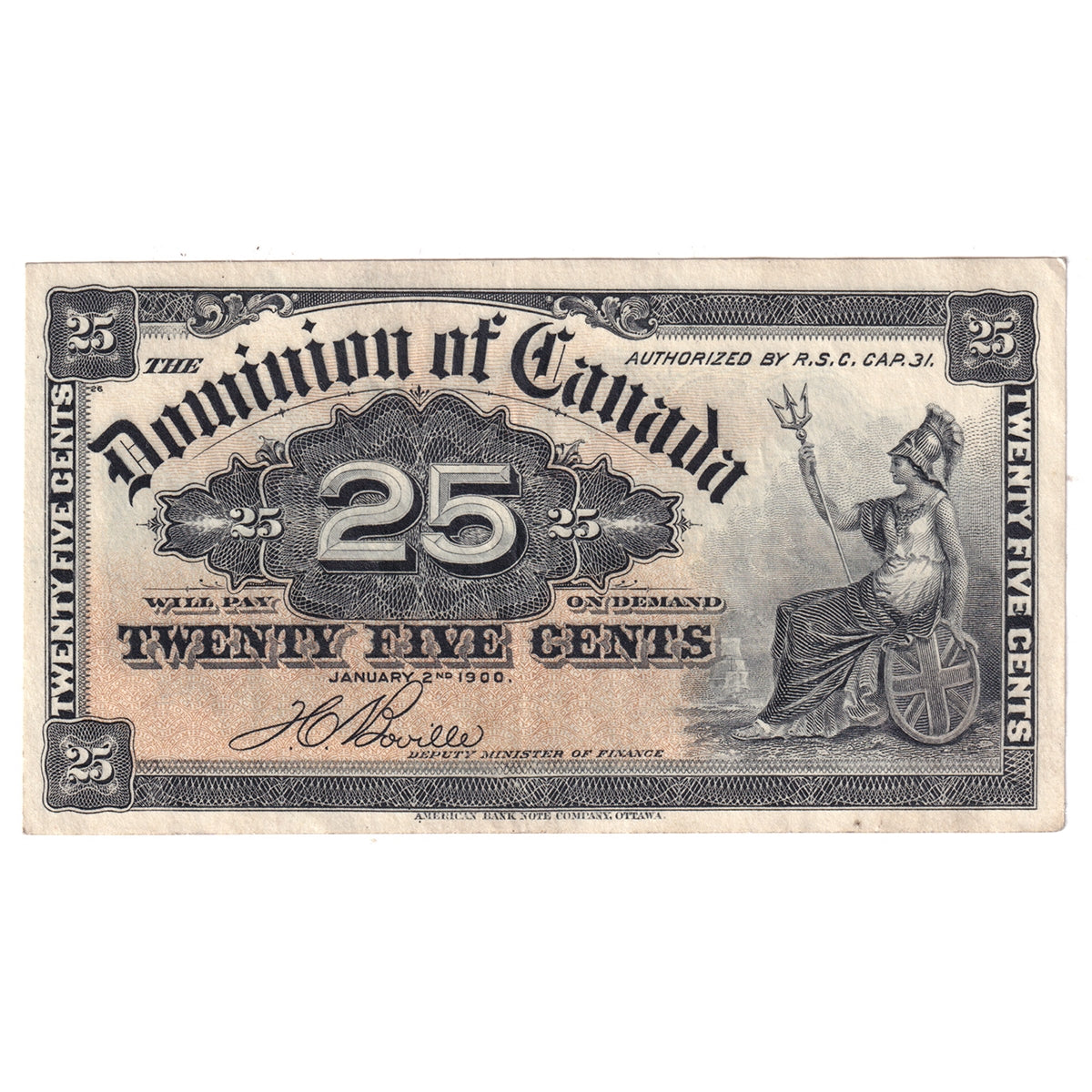 In 1900, on behalf of the Canadian government, the American Bank Note Company added the 25-cent (also known as the shinplaster) to the denominations of Dominion of Canada banknotes. Only one signature adores these 1900 25-cent issued banknotes, which was the Deputy Minister of Finance at the time.