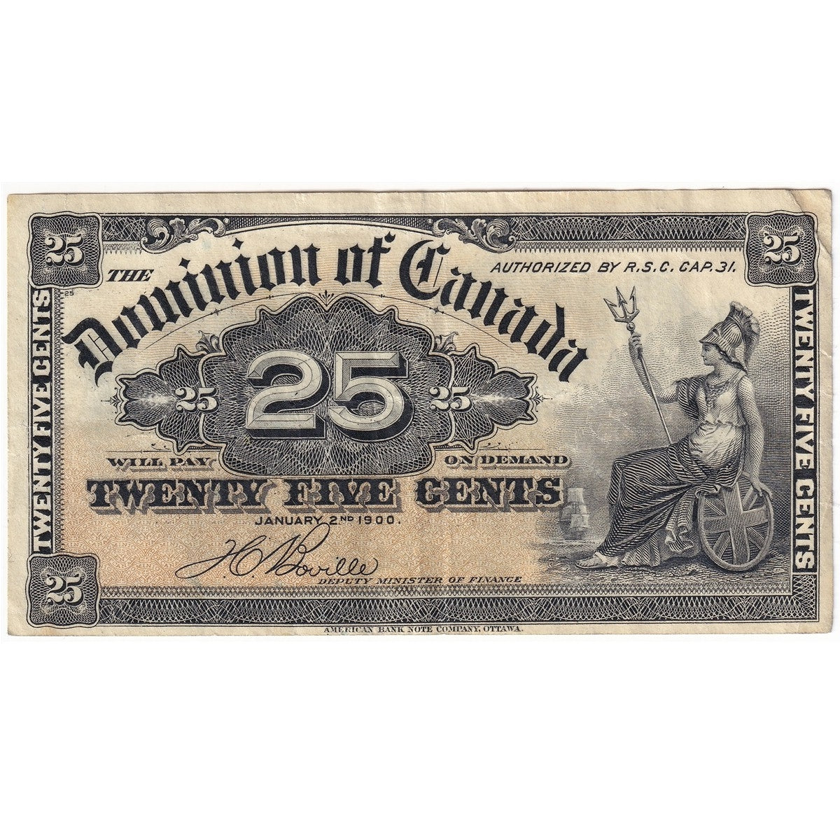 In 1900, on behalf of the Canadian government, the American Bank Note Company added the 25-cent (also known as the shinplaster) to the denominations of Dominion of Canada banknotes. Only one signature adores these 1900 25-cent issued banknotes, which was the Deputy Minister of Finance at the time.