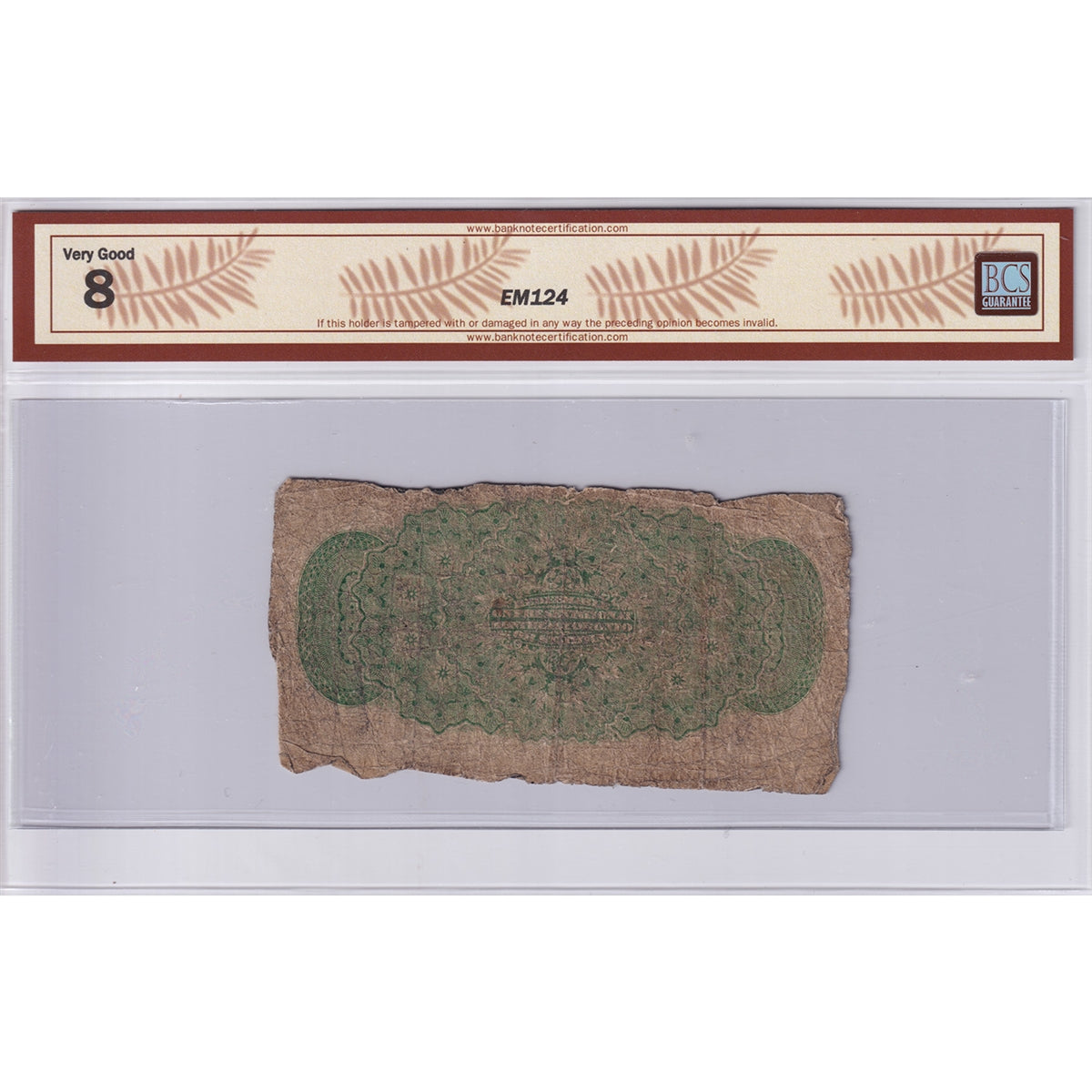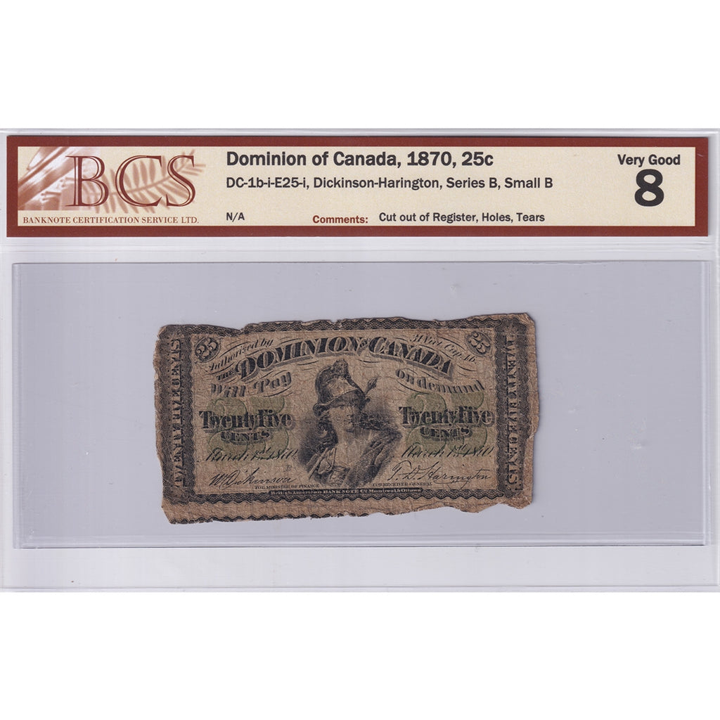 DC-1b-i-E25-i 1870 Dominion 25-cent Shinplaster, Dickinson-Harington, Series B, Small B, BCS Certified VG-8 (Cut out of Register, Holes, Tears)