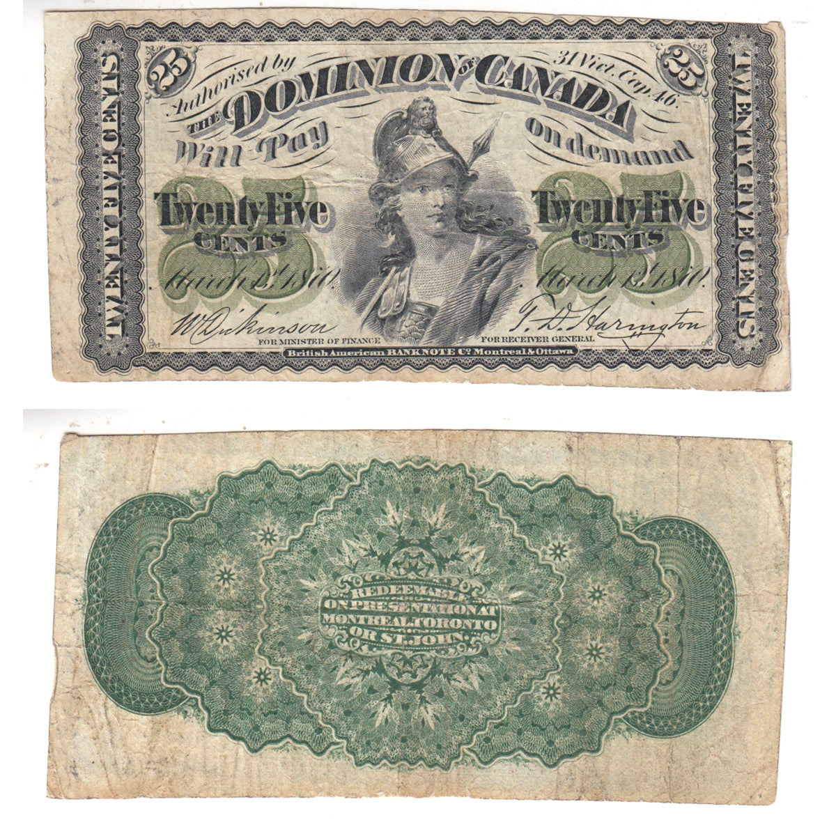 Back Design: Lathework and "redeemable on presentation at Montreal, Toronto, or St. John"