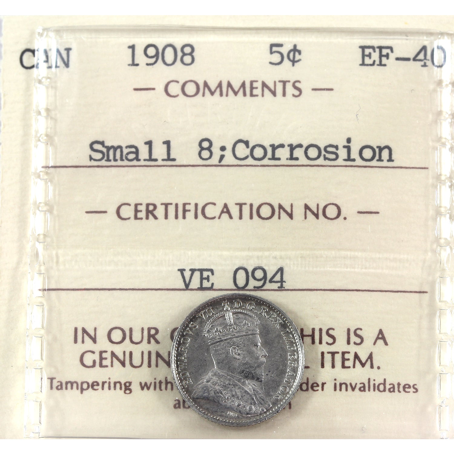 1908 Small 8 Canada 5-cents ICCS Certified EF40 (corrosion)