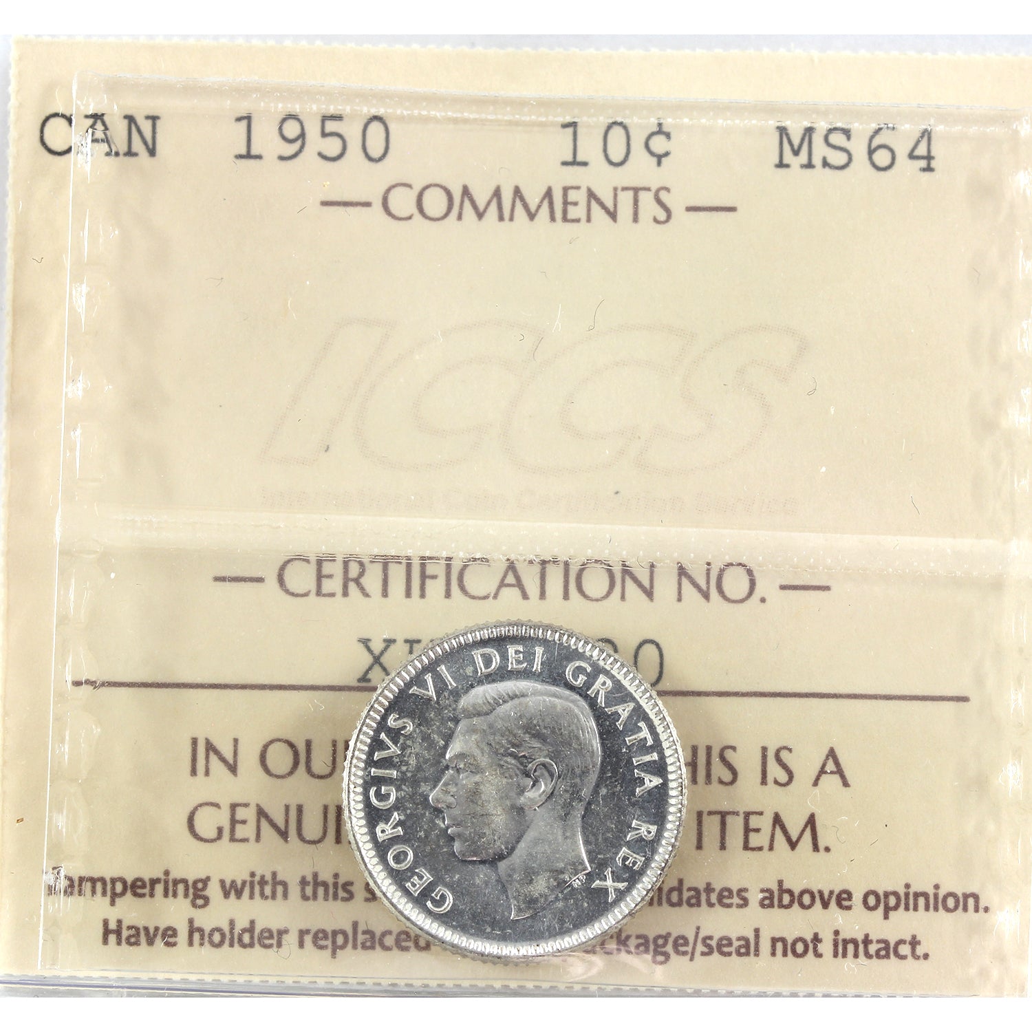 1950 Canada 10-cents ICCS Certified MS64 (fingerprint)