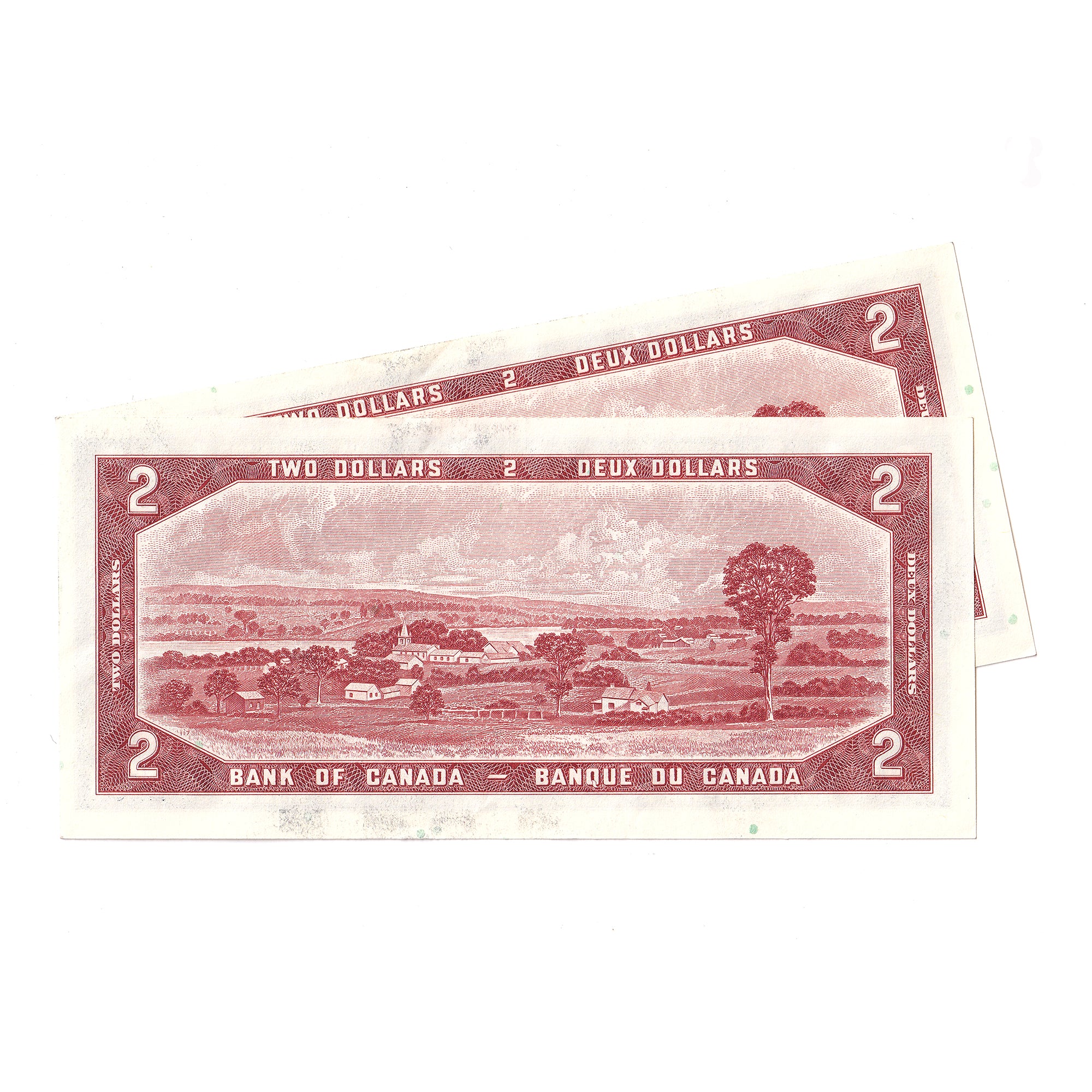 Lot of 2x Consecutive 1954 Canada $2 Notes, Beattie-Rasminsky, Y/R, 2Pcs.
