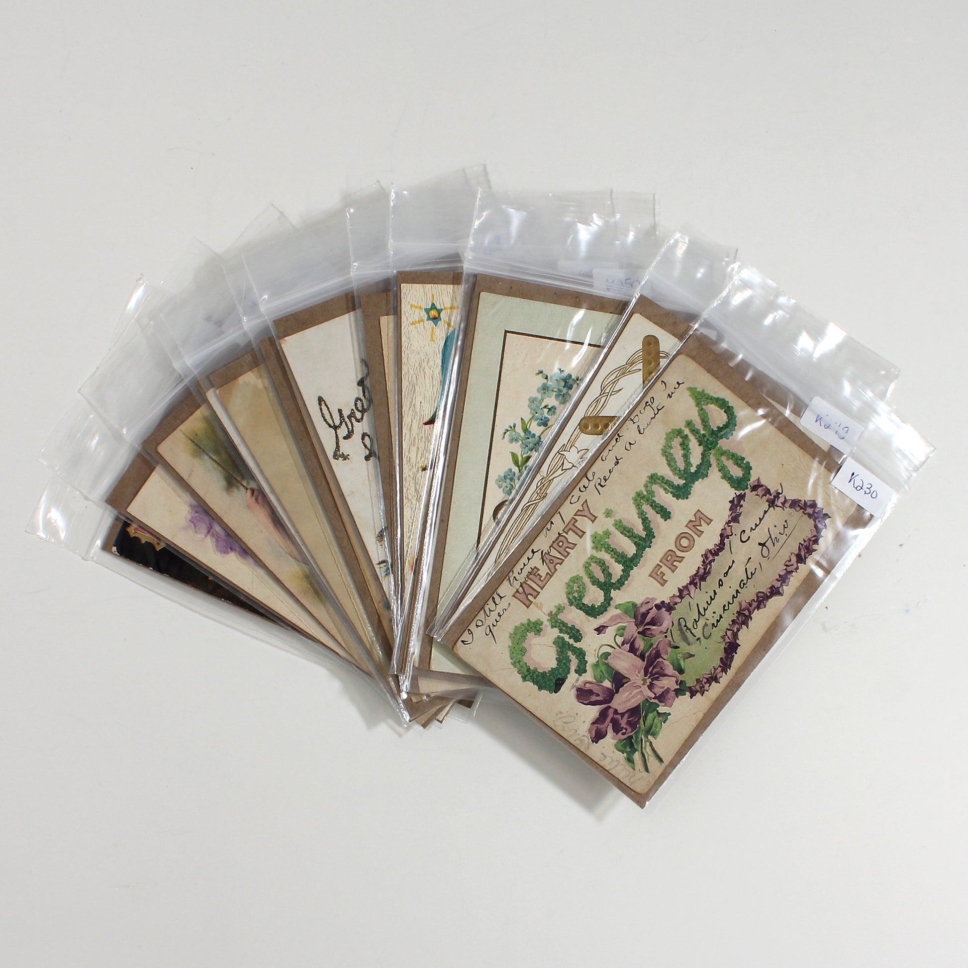 This lot contains over 40 antique postcards (pre-1925) with a mixture of postmarked, written on but not posted, and blank cards. Most or all postmarks are for locations in the United States. Cards depict greetings such as Birthday and Best Wishes. Cards may have some cosmetic damage such as bent corners, creases and damage along the edge.