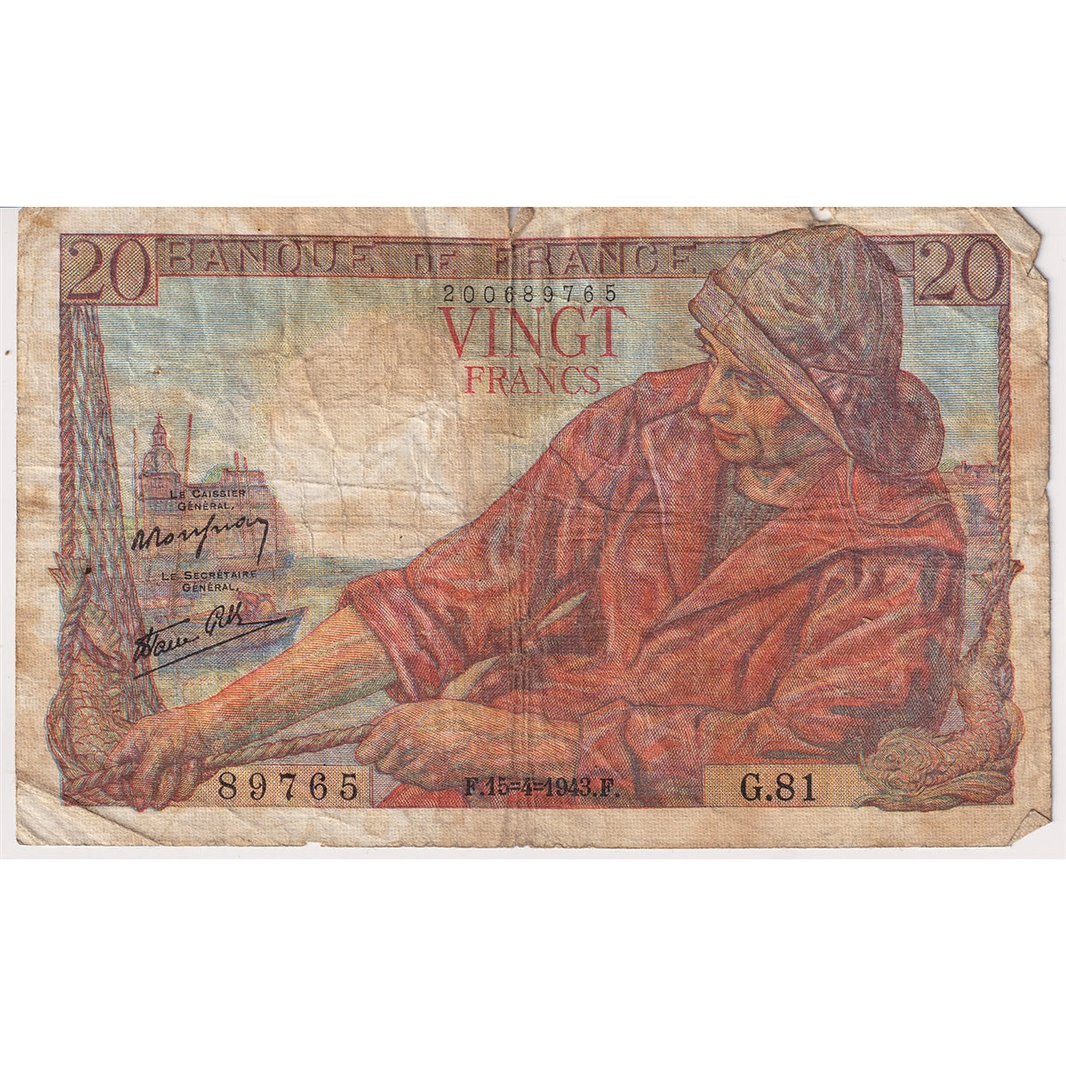 France 1943 20 Francs Note, Fine (Damaged). Image is an example note.