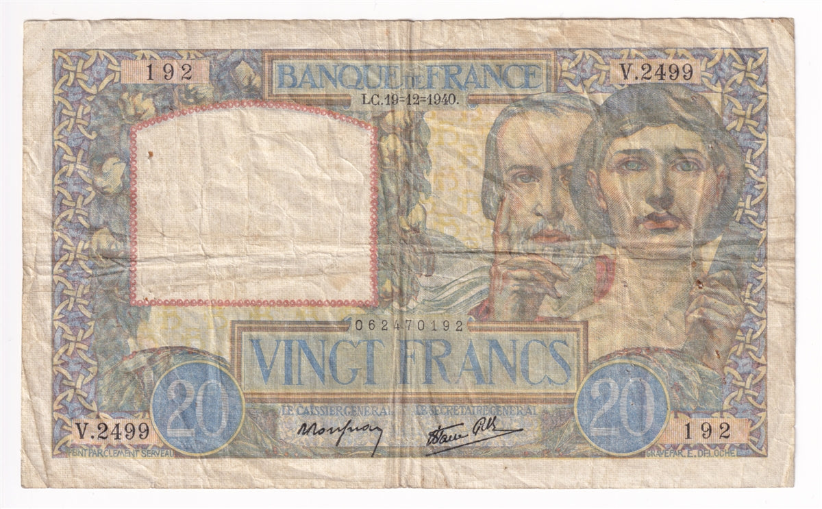 1940 France Paper Money 20 Francs, Fine (holes). Image is an example of what you will receive.