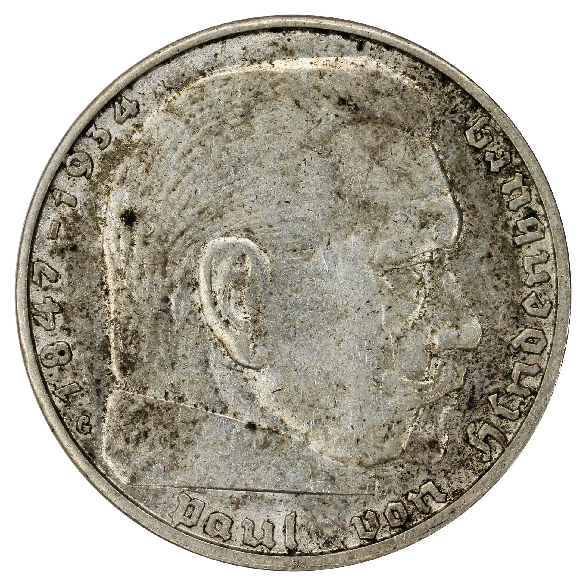 Reverse: A large portrait of Paul von Hindenburg facing to the right with the mintmark between Hindenburg's neck and "1847", with the legend around.