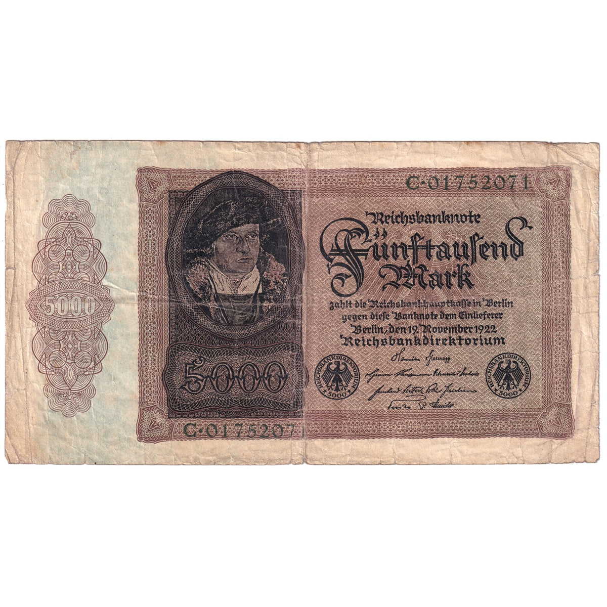 1922 Gemany 5000 Mark Note, VG-F (Tears)