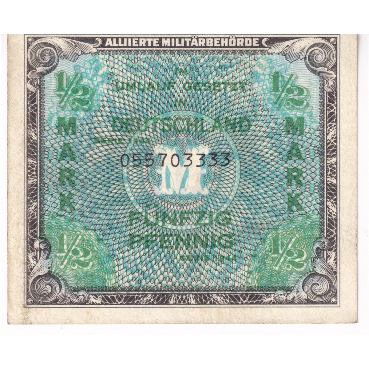 Germany Note, 1944 1/2 Mark, with F, Pick #191a, AU. Image is an example of what you will receive.