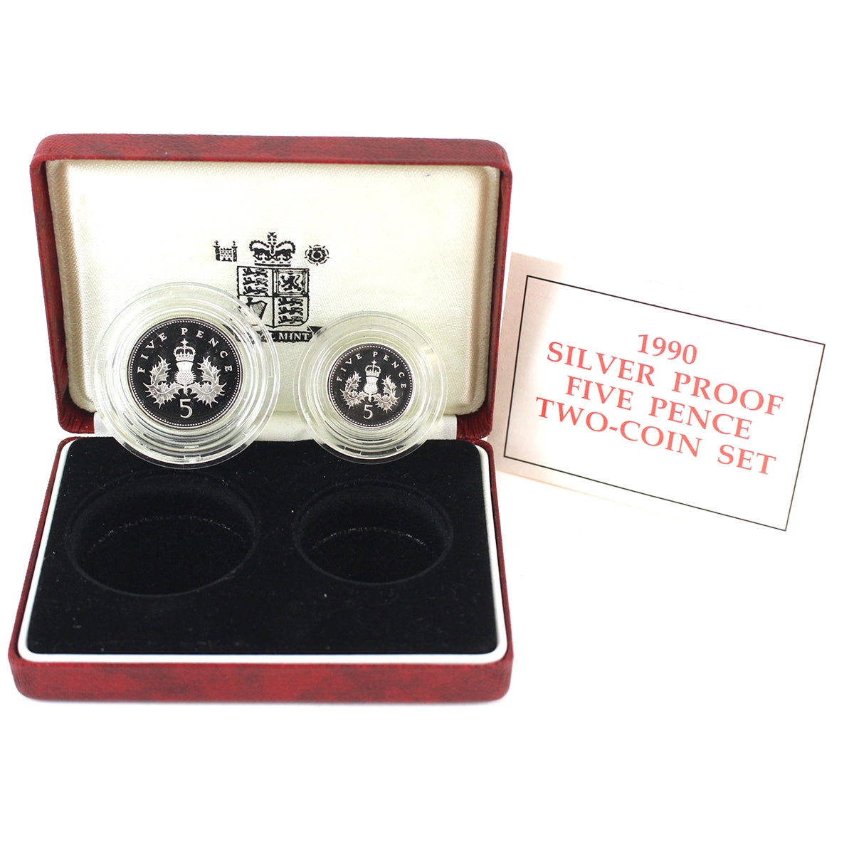 Great Britain 1990 Sterling Silver Proof 5 Pence Two-coin Set in Case. Includes CoA. The coins weigh 5.65 grams and 3.25g respectively. At least of the two is scratched; capsules may be scratched. The silver has some bluish toning. Image is an example of the set.