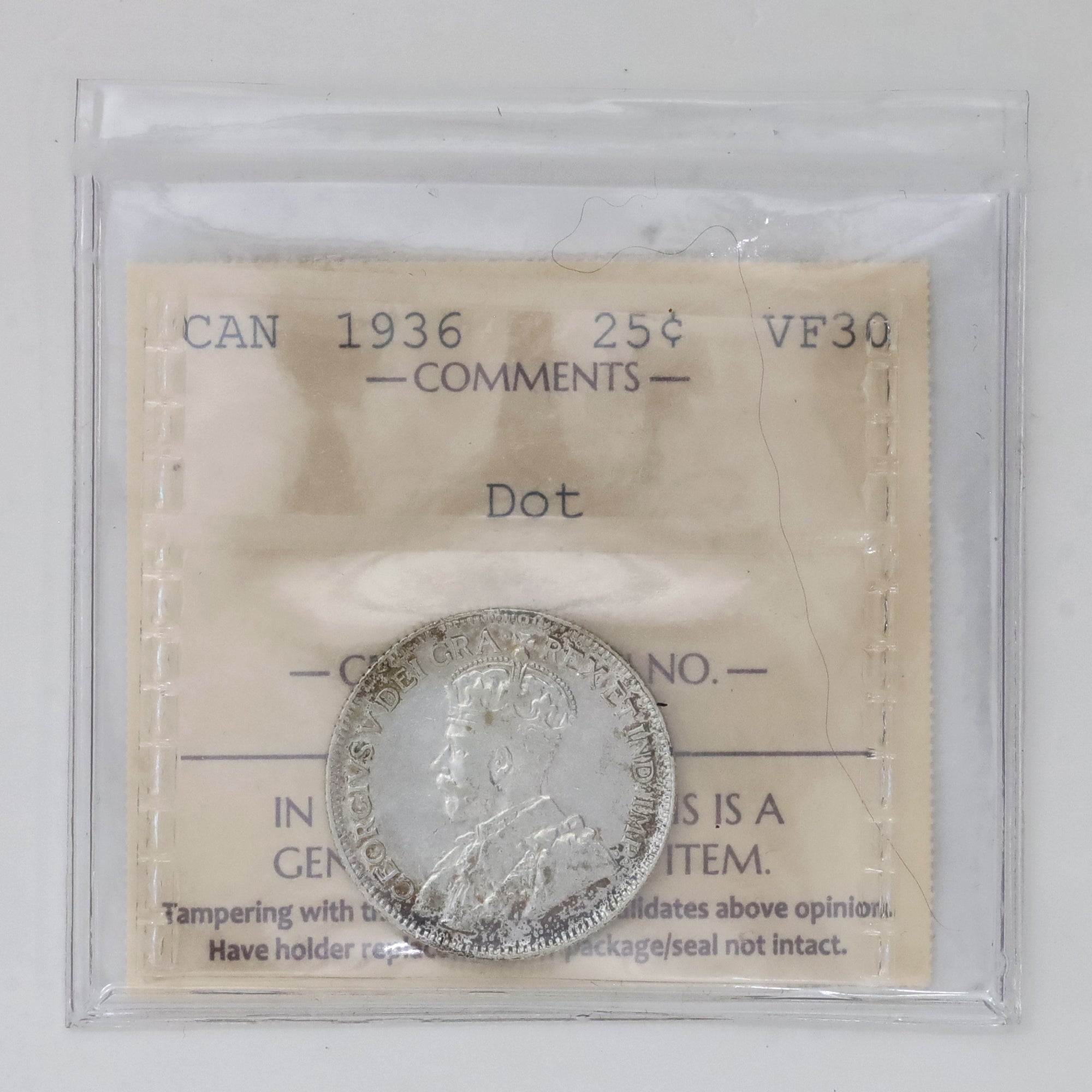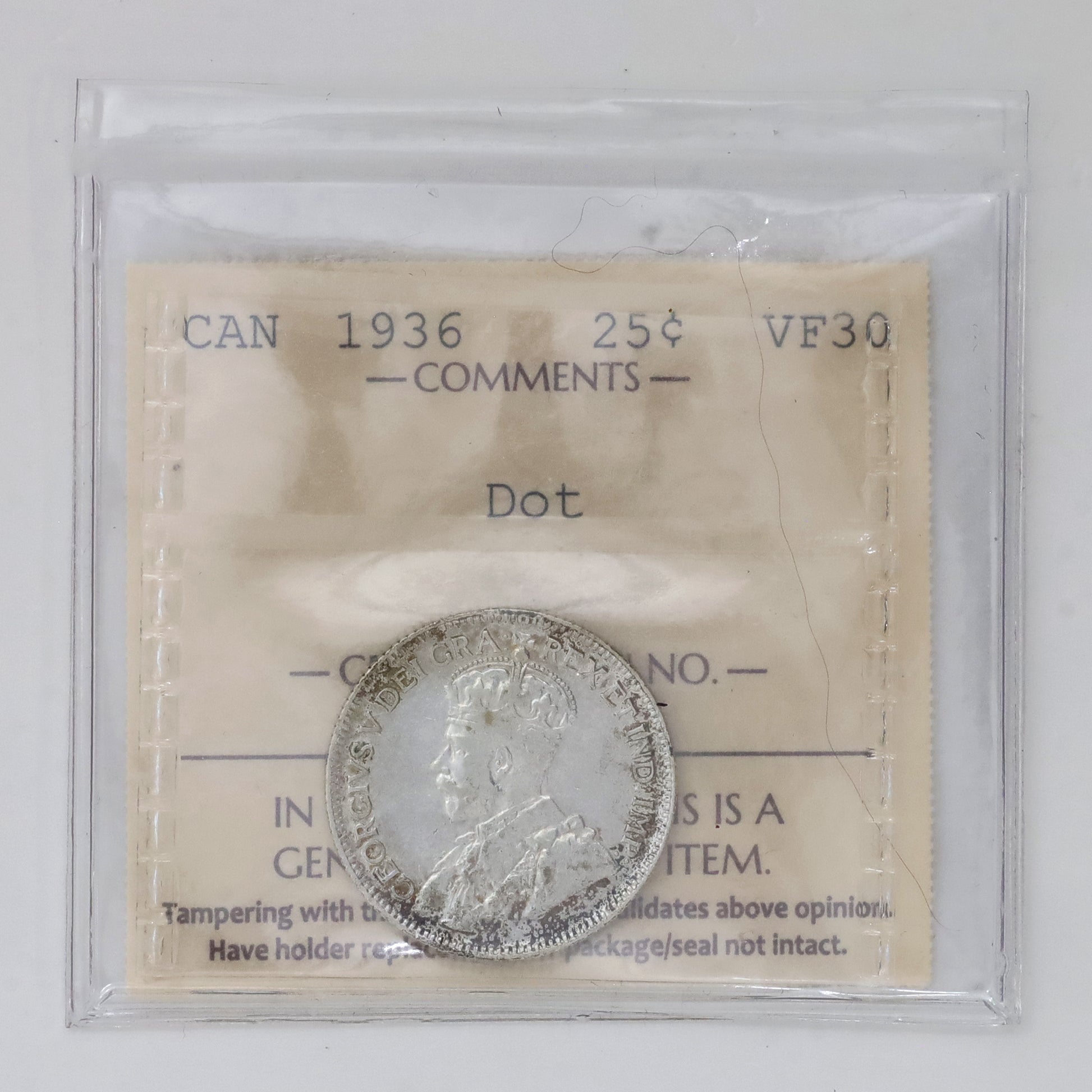 1936 Dot Canada 25-cents ICCS Certified VF30 (Toned)