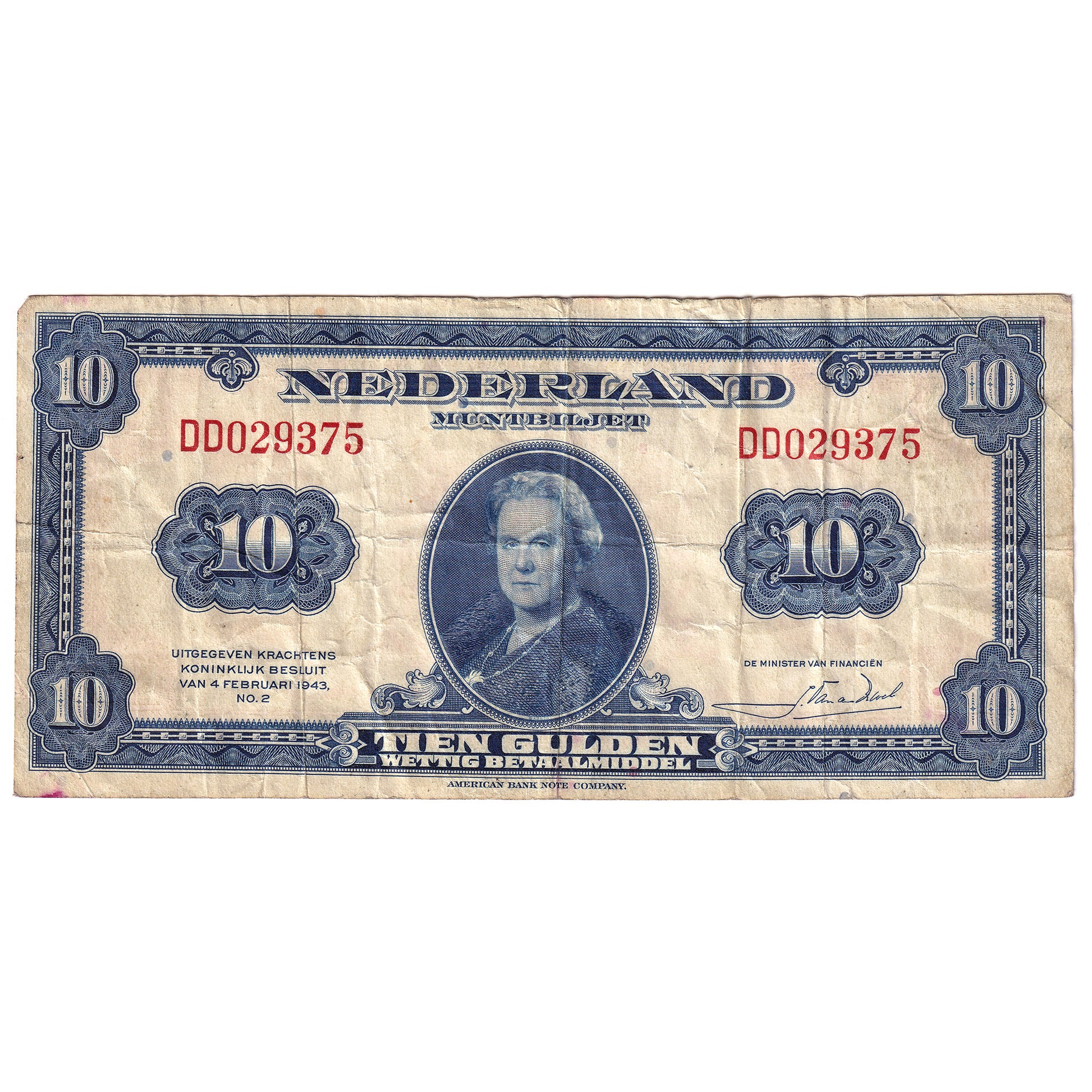 Netherlands 1943 10 Gulden, Pick #66a, VF (tear)