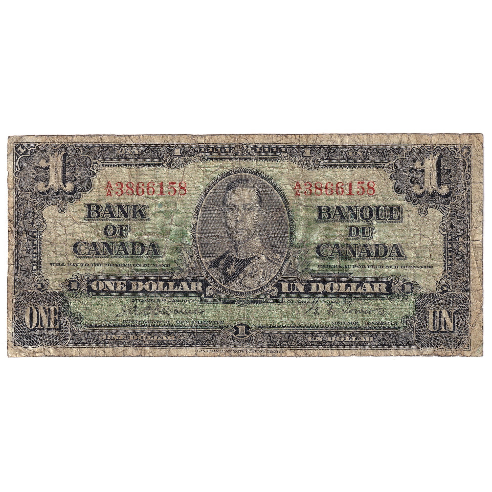 BC-21a 1937 Canada $1 Osborne-Towers, A/A, VG (small tears)