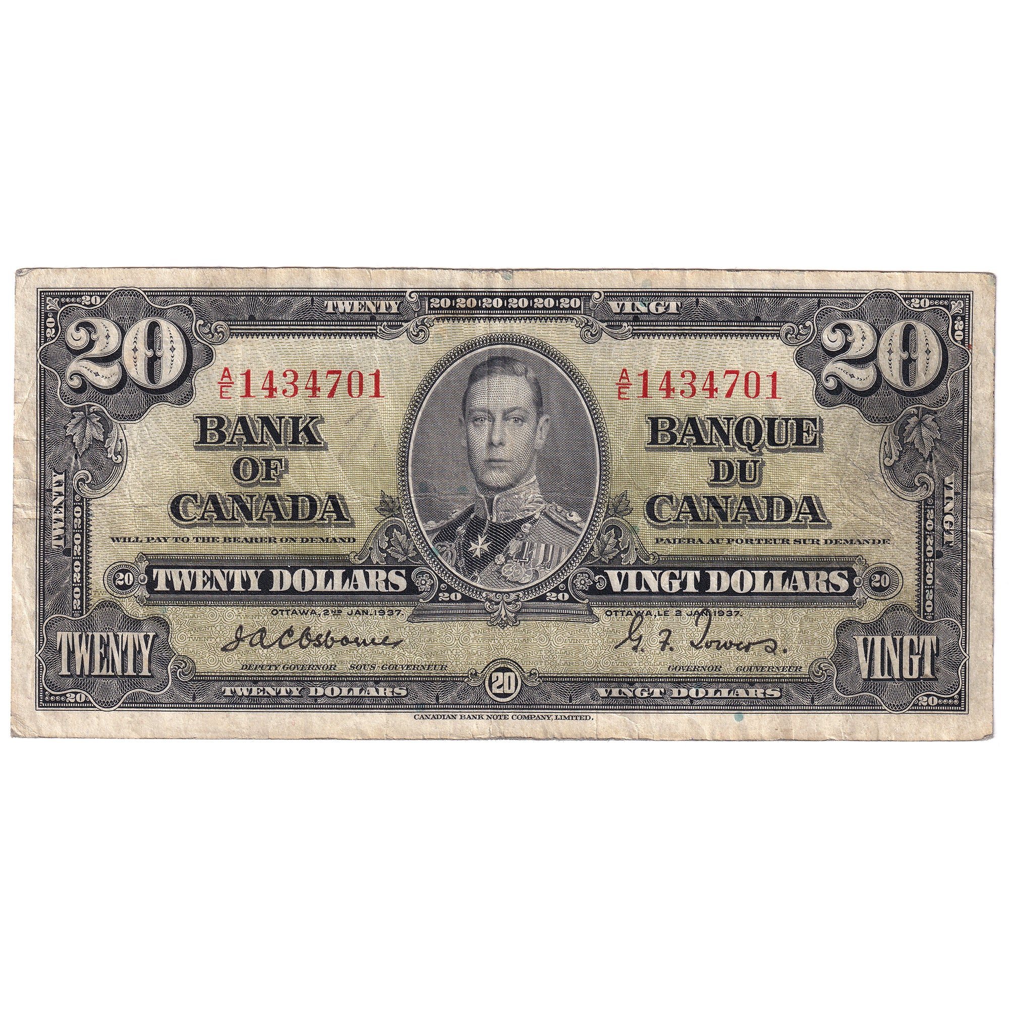 BC-25a 1937 Canada $20 Osborne-Towers, A/E (writing)