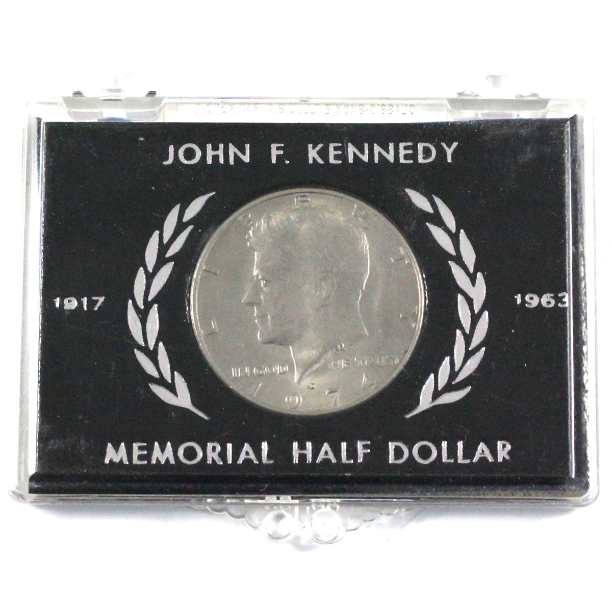 This Kennedy half dollar could be any date from 1971 to date in the special memorial holder. The holder could be in black or White.